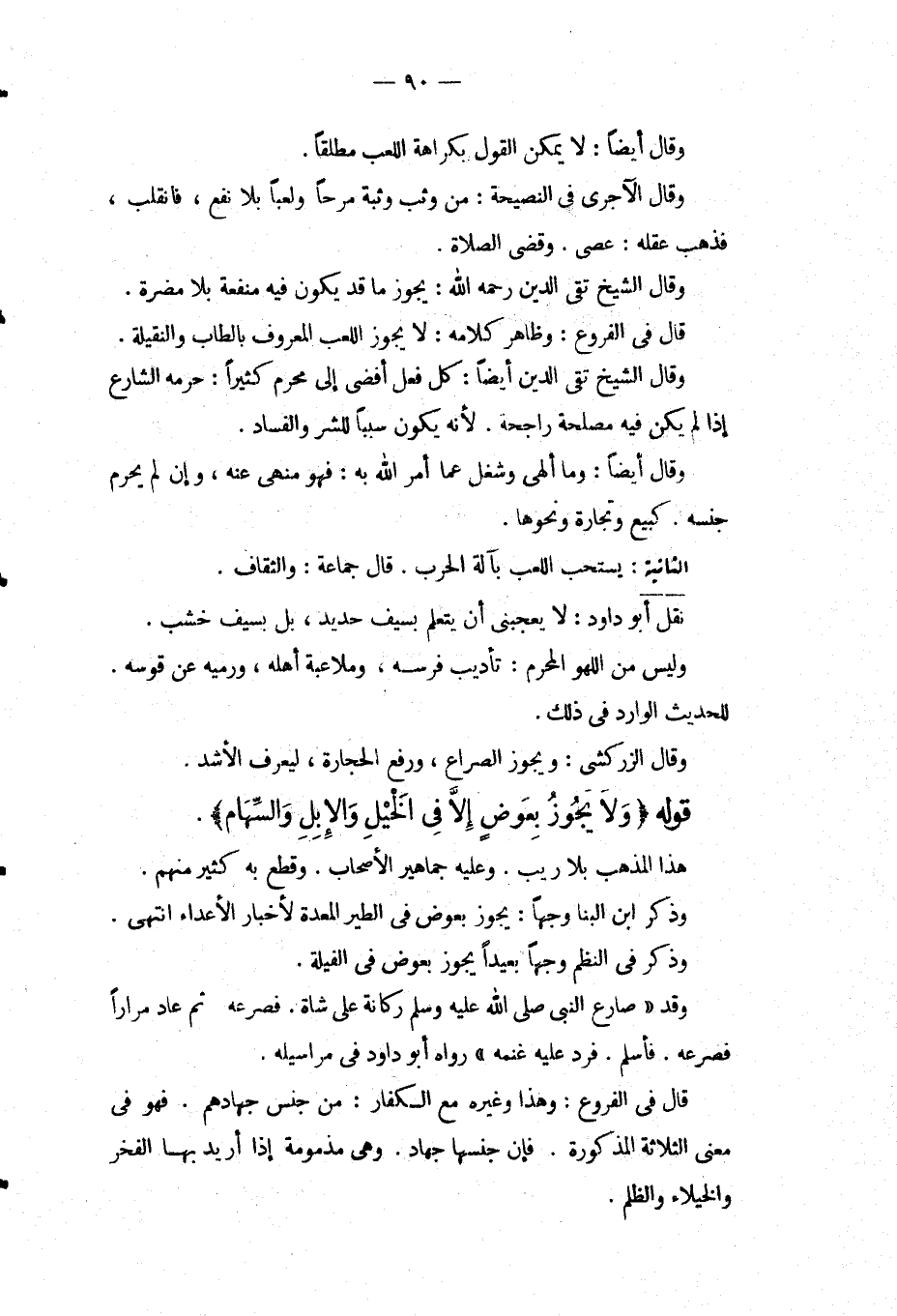وَقَالَ أَيْضًا: لَا يُمْكِنُ الْقَوْلُ بِكَرَاهَةِ اللَّعِبِ مُطْلَقًا. وَقَالَ الْآجُرِّيُّ فِي النَّصِيحَةِ: مَنْ وَثَبَ وَثْبَةً مَرِحًا وَلَعِبًا بِلَا نَفْعٍ، فَانْقَلَبَ، فَذَهَبَ عَقْلُهُ: عَصَى. وَقَضَى الصَّلَاةَ. وَقَالَ الشَّيْخُ تَقِيُّ الدِّينِ - رَحِمَهُ اللَّهُ -: يَجُوزُ مَا قَدْ يَكُونُ فِيهِ مَنْفَعَةٌ بِلَا مَضَرَّةٍ. قَالَ فِي الْفُرُوعِ: وَظَاهِرُ كَلَامِهِ: لَا يَجُوزُ اللَّعِبُ الْمَعْرُوفُ بِالطَّابِ وَالنَّقِيلَةِ. وَقَالَ الشَّيْخُ تَقِيُّ الدِّينِ أَيْضًا: كُلُّ فِعْلٍ أَفْضَى إلَى مُحَرَّمٍ كَثِيرًا: حَرَّمَهُ الشَّارِعُ إذَا لَمْ يَكُنْ فِيهِ مَصْلَحَةٌ رَاجِحَةٌ. لِأَنَّهُ يَكُونُ سَبَبًا لِلشَّرِّ وَالْفَسَادِ. وَقَالَ أَيْضًا: وَمَا أَلْهَى وَشَغَلَ عَمَّا أَمَرَ اللَّهُ بِهِ: فَهُوَ مَنْهِيٌّ عَنْهُ، وَإِنْ لَمْ يُحَرَّمْ جِنْسُهُ. كَبَيْعٍ وَتِجَارَةٍ وَنَحْوِهَا.