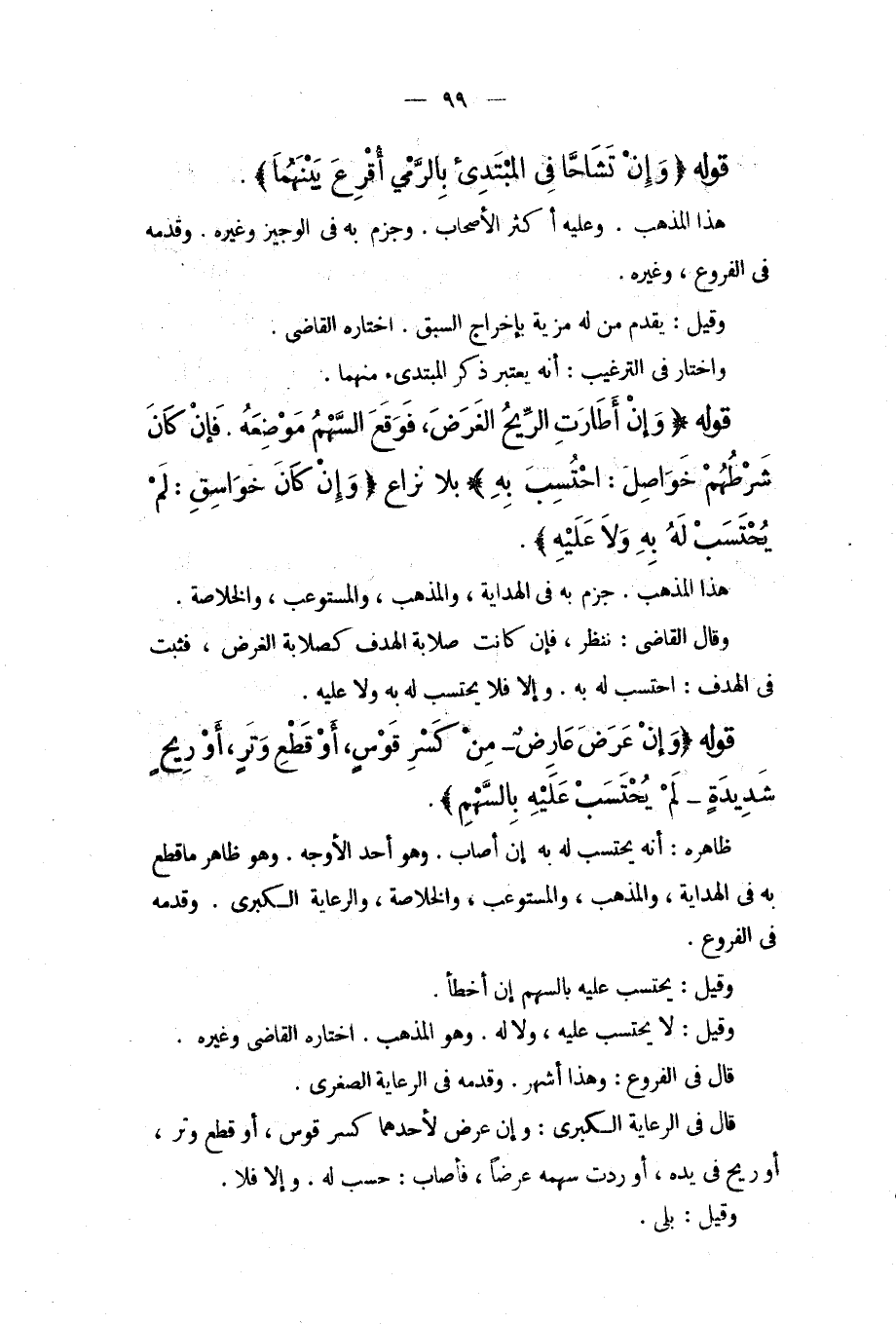 قَوْلُهُ (وَإِنْ عَرَضَ عَارِضٌ مِنْ كَسْرِ قَوْسٍ، أَوْ قَطْعِ وَتَرٍ، أَوْ رِيحٍ شَدِيدَةٍ لَمْ يَحْتَسِبْ عَلَيْهِ بِالسَّهْمِ) . ظَاهِرُهُ: أَنَّهُ يُحْتَسَبُ لَهُ بِهِ إنْ أَصَابَ. وَهُوَ أَحَدُ الْأَوْجُهِ. وَهُوَ ظَاهِرُ مَا قَطَعَ بِهِ فِي الْهِدَايَةِ، وَالْمُذْهَبِ، وَالْمُسْتَوْعِبِ، وَالْخُلَاصَةِ، وَالرِّعَايَةِ الْكُبْرَى. وَقَدَّمَهُ فِي الْفُرُوعِ. وَقِيلَ: يَحْتَسِبُ عَلَيْهِ بِالسَّهْمِ إنْ أَخْطَأَ. وَقِيلَ: لَا يَحْتَسِبُ عَلَيْهِ، وَلَا لَهُ. وَهُوَ الْمَذْهَبُ. اخْتَارَهُ الْقَاضِي وَغَيْرُهُ. قَالَ فِي الْفُرُوعِ: وَهَذَا أَشْهَرُ. وَقَدَّمَهُ فِي الرِّعَايَةِ الصُّغْرَى. قَالَ فِي الرِّعَايَةِ الْكُبْرَى: وَإِنْ عَرَضَ لِأَحَدِهِمَا كَسْرُ قَوْسٍ، أَوْ قَطْعُ وَتَرٍ، أَوْ رِيحٌ فِي يَدِهِ، أَوْ رَدَّتْ سَهْمَهُ عَرْضًا، فَأَصَابَ: حُسِبَ لَهُ. وَإِلَّا فَلَا. وَقِيلَ: بَلَى.