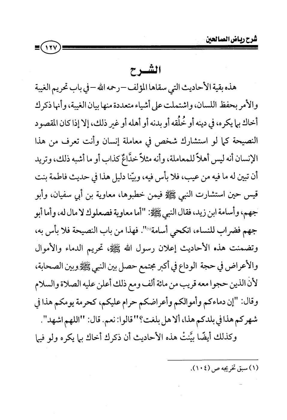 EXهذه بقية الأحاديث التي ساقها المؤلف رحمه الله في باب الغيبة والأمر بحفظ اللسان، واشتملت على أشياء متعددة منها بيان الغيبة، وأنها ذكرك أخاك بما يكره، وقد سبق لنا بيان هذا وأن الغيبة ذكرك أخاك بما يكره في دينه أو خلقه أو بدنه أو أهله أو غير ذلك، إلا إذا كان المقصود النصيحة، كما لو استشارك شخص في معاملة إنسان وأنت تعرف من هذا الإنسان أنه ليس أهلاً للمعاملة، وأنه مثلاً كذاب أو ما أشبه ذلك، وأردت أن تبين له ما فيه من عيب، فلا بأس فيه، وبينا دليل هذا في حديث فاطمة بنت قيس حين استشارت النبي فيمن خطبوها معاوية بن أبي سفيان وأبو جهم وأسامة بن زيد، فقال النبي صلى الله عليه وسلم أما معاوية فصعلوك لا مال له، وأما أبو جهم فضراب للنساء، انكحي أسامة، فهذا من باب النصيحة فلا بأس بها، وتضمنت هذه الأحاديث إعلان رسول الله صلى الله عليه وسلم تحريم الدماء والأموال والأعراض في حجة الوداع في أكبر مجتمع حصل بين النبي صلى الله عليه وسلم وبين الصحابة؛ لأن الذين حجوا معه قريب من مائة ألف، ومع ذلك أعلن عليه الصلاة والسلام وقال: إن أموالكم ودماءكم وأعراضكم حرام عليكم، كحرمة يومكم هذا، في شهركم هذا، في بلدكم هذا، ألا هل بلغت؟ قالوا: نعم قال: اللهم اشهد.