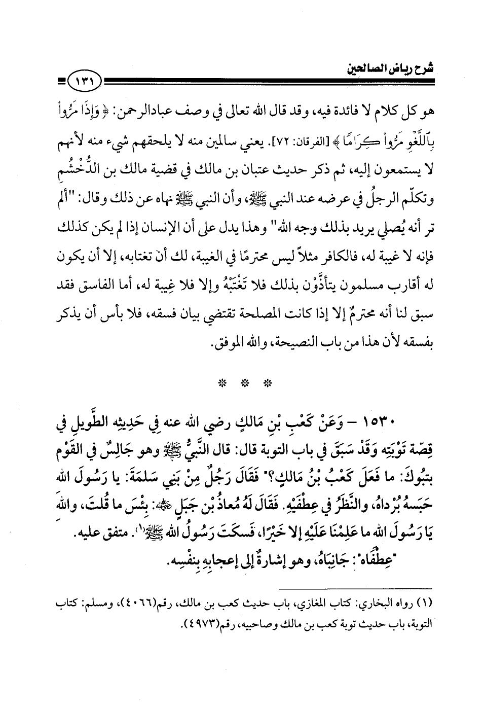 1530 - وعن كعب بن مالك رضي الله عنه في حديثه الطويل في قصة توبته وقد سبق في باب التوبة، قال: قال النبي صلى الله عليه وسلم وهو جالس في القوم بتبوك: ما فعل كعب بن مالك؟ فقال رجل من بني سلمة: يا رسول الله حبسه برداه، والنظر في عطفيه.