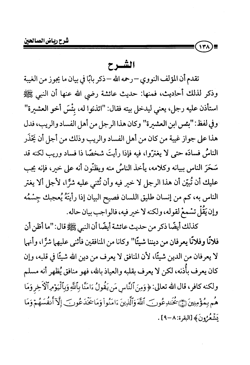 EXتقدم أن النووي رحمه الله ذكر باباً في بيان ما يجوز من الغيبة وذكر لذلك أحاديث فمنها حديث عائشة رضي الله عنها أن النبي صلى الله عليه وسلم استأذن عليه رجل، يعني ليدخل بيته فقال ائذنوا له، بئس أخو العشيرة وفي لفظ بئس ابن العشيرة وكان هذا الرجل من أهل الفساد والغي، فدل هذا على جواز غيبة من كان من أهل الفساد والغي وذلك من أجل أن يحذر الناس فساده حتى لا يغتروا فيه فإذا رأيت شخصًا ذا فساد وغي لكنه قد سحر الناس ببيانه وكلامه يأخذ الناس منه ويظنون أنه على خير، فإنه يجب عليك أن تبين أن هذا الرجل لا خير فيه وأن تثني عليه شرًا؛ لأجل ألا يغتر الناس به، كم من إنسان طليق اللسان فصيح البيان إذا رأيته يعجبك جسمه وإن يقول تسمع لقوله، ولكنه لا خير فيه، فالواجب بيان حاله، كذلك أيضاً ذكر أن النبي صلى الله عليه وسلم من حديث عائشة أيضاً قال ما أظن أن فلانًا وفلانًا يعرفان من دينناً شيء وكانا من المنافقين فأثنى عليهما شرًا وأنهما لا يعرفان من الدين شيئاً، لأن المنافق لا يعرف من دين الله شيئاً في قلبه وإن كان يعرف بأذنه، لكن لا يعرف بقلبه والعياذ بالله، فهو منافق يظهر أنه مسلم ولكنه كافر، قال الله تعالى: ومن الناس من يقول آمنا بالله وباليوم الآخر وما هم بمؤمنين يخادعون الله والذين آمنوا وما يخدعون إلا أنفسهم وما يشعرون.