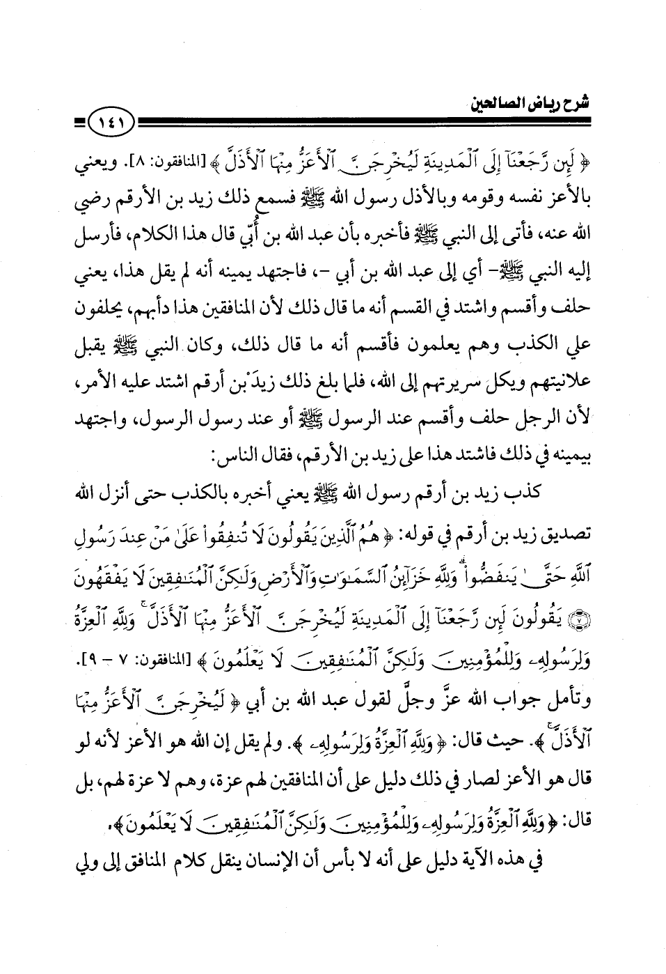 {لئن رجعنا إلى المدينة ليخرجن الأعز منها الأذل} ويعني بالأعز نفسه وقومه، وبالأذل رسول الله صلى الله عليه وسلم فسمع ذلك زيد بن الأرقم رضي الله عنه فأتى إلى النبي صلى الله عليه وسلم فأخبره بأن عبد الله بن أبي قال هذا الكلام، فأرس إليه النبي صلى الله عليه وسلم - أي عبد الله بن أبي -، فاجتهد يمينه أنه لم يقل هذا، يعني حلف وأقسم واشتد في القسم أنه ما قال ذلك؛ لأن المنافقين هذا دأبهم، يحلفون علي الكذب وهم يعلمون فأقسم أنه ما قال ذلك، وكان النبي صلى الله عليه وسلم يقبل علانيتهم ويترك سريرتهم إلى الله، فلما بلغ ذلك زيد بن الأرقم اشتد عليه الأمر؛ لأن الرجل حلف وأقسم عند الرسول الله صلى الله عليه وسلم واجتهد يمينه في ذلك فاشتد هذا على زيد بن الأرقم، فقال: كذب زيد بن الأرقم رسول الله صلى الله عليه وسلم يعني أخبره بالكذب حتى أنزل الله تصديق زيد بن الأرقم في قوله: {هم الذين يقولون لا تنفقوا على من عند رسول الله حتى ينفضوا ولله خزائن السماوات والأرض ولكن المنافقين لا يفقهون يقولون لئن رجعنا إلى المدينة ليخرجن الأعز منها الأذل ولله العزة ولرسوله وللمؤمنين ولكن المنافقين لا يعلمون} وتأمل جواب الله عز وجل لقول عبد الله بن أبي [ليخرجن الأعز منها الأذل] حيث قال: {ولله العزة ولرسوله} ولم يقل إن الله هو الأعز لأنه لو قال هو الأعز لصار في ذلك دليل على أن المنافقين لهم العزة، وهم لا عزة لهم، بل قال {ولله العزة ولرسوله وللمؤمنين ولكن المنافقين لا يعلمون} في هذه الآية دليل على أنه لا بأس أن الإنسان ينقل كلام المنافق إلى ولي