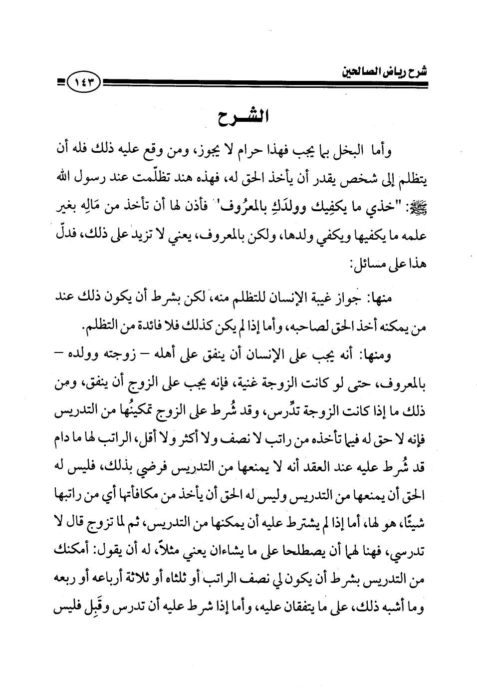 وأما البخل بما يزيد فهذا حرام لا يجوز، ومن وقع عليه ذلك فله أن يتظلم إلى شخص يمكن أن يأخذ الحق له، فهذه هند تظلمت عند الرسول صلى الله عليه وسلم ولم يقل لها لا تقولي رجل شحيح، أقرها على ذلك لأنها تطلب حقها، فقال لها النبي صلى الله عليه وسلم خذي ما يكفيك ويكفي ولدك بالمعروف فأذن لها أن تأخذ من ماله بغير علمه ما يكفيها ويكفي ولدها، ولكن بالمعروف، يعني لا تزيد على ذلك، فدل هذا على مسائل: أولاً: جواز غيبة الإنسان للتظلم منه، لكن بشرط أن يكون ذلك عند من يمكنه أخذ الحق لصاحبه، وأما إذا لم يكن كذلك فلا فائدة من التظلم، ومنها أنه يجب على الإنسان أن ينفق على أهله على زوجته وولده بالمعروف، حتى لو كانت الزوجة غنية، فإنه يجب على الزوج أن ينفق، ومن ذلك ما إذا كانت الزوجة تدرس، وقد شرط على الزوج تمكينها من تدريسها فإنه لا حق له فيما تأخذه من راتب لا نصف ولا أكثر ولا أقل، الراتب لها مادام قد شرط عليه عند العقد أنه لا يمنعها من التدريس فرضي بذلك، فليس له الحق أن يمنعها من التدريس وليس له الحق أن يأخذ من مكافأتها أي من راتبها شيئاً، هو لها، أما إذا لم يشترط عليه أن يمكنها من التدريس، ثم لما تزوج قال لا تدرسي، فهنا لهما أن يصطلحا على ما يشاءان، يعني مثلاً له أن يقول: أمكنك من التدريس بشرط أن يكون لي نصف الراتب أو ثلثاه أو ثلاثة أرباعه أو ربعه وما أشبه ذلك، على ما يتفقان عليه، وأما إذا شرط عليه أن تدرس وقبل فليس