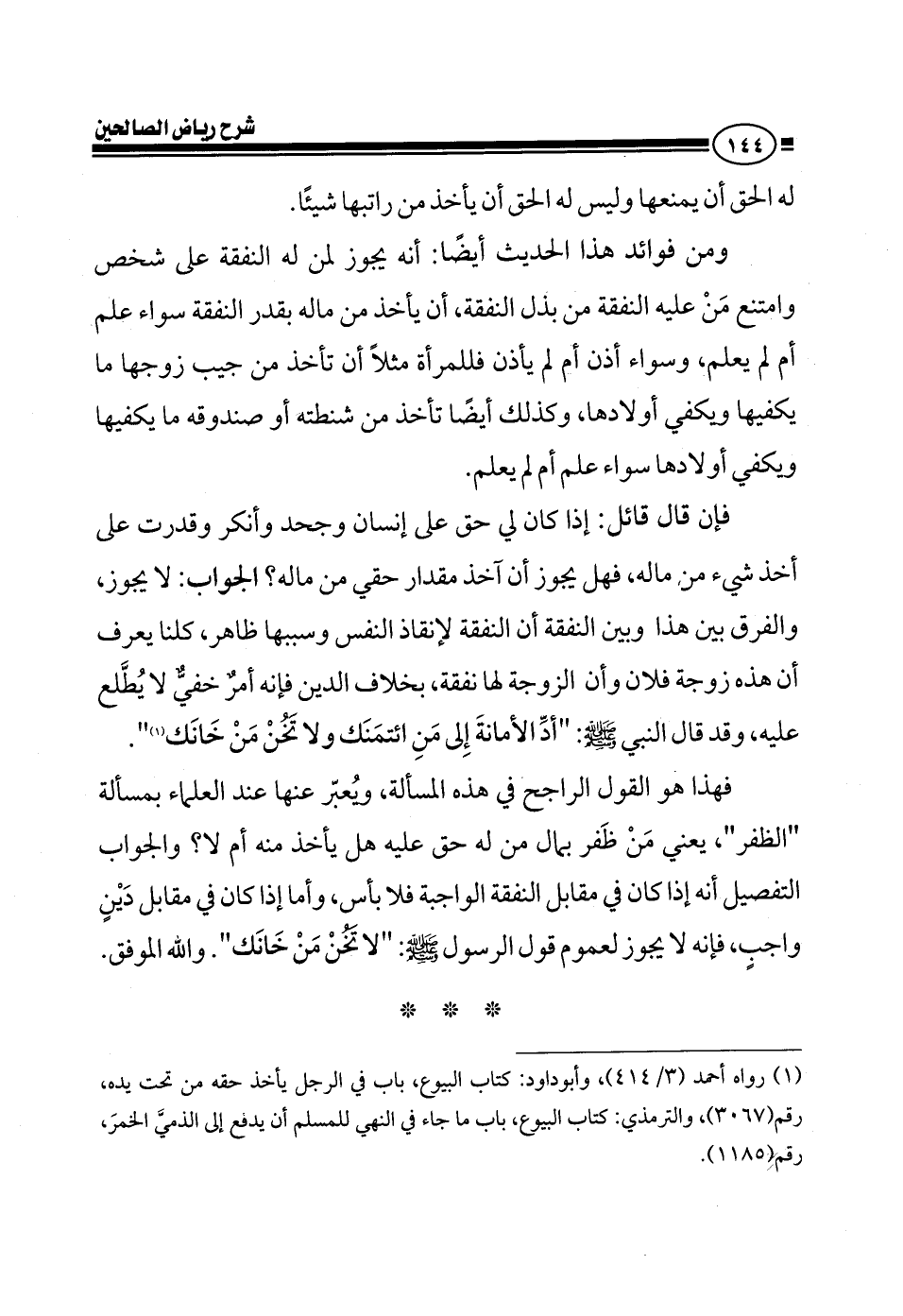 له الحق أن يمنعها وليس له الحق أن يأخذ من راتبها شيئاً ومن فوائد هذا الحديث أيضاً أنه يجوز لمن له النفقة على شخص وامتنع من عليه النفقة من بذل النفقة، أن يأخذ من ماله بقدر النفقة سواء علم أم لم يعلم، وسواء أذن أم لم يأذن فللمرأة مثلاً أن تأخذ من جيب زوجها ما يكفيها ويكفي أولادها، وكذلك أيضًا تأخذ من شنطته أو صندوقه ما يكفيها ويكفي أولادها سواء علم أم لم يعلم، فإن قال قائل: إذا كان لي حق على إنسان وجحد وأنكر وقدرت على أخذ شيء من ماله، فهل يجوز أن آخذ مقدار حقي من ماله؟ يعني مثلاً إنسان عنده لي مائة ريال وجحد قال: ما لك عندي شيء فهل إذا قدرت على شيء من ماله يجوز أن أخذ من ماله مائة ريال؟ الجواب لا، لا يجوز، والفرق بين هذا وبين النفقة أن النفقة لإنقاذ النفس وسببها ظاهر، كلنا يعرف أن هذه زوجة فلان وأن الزوجة لها نفقة، بخلاف الدين فإنه أمر خفي لا يقال عليه، وقد قال النبي صلى الله عليه وسلم: أدي الأمانة إلى من ائتمنك ولا تخن من خانك.
