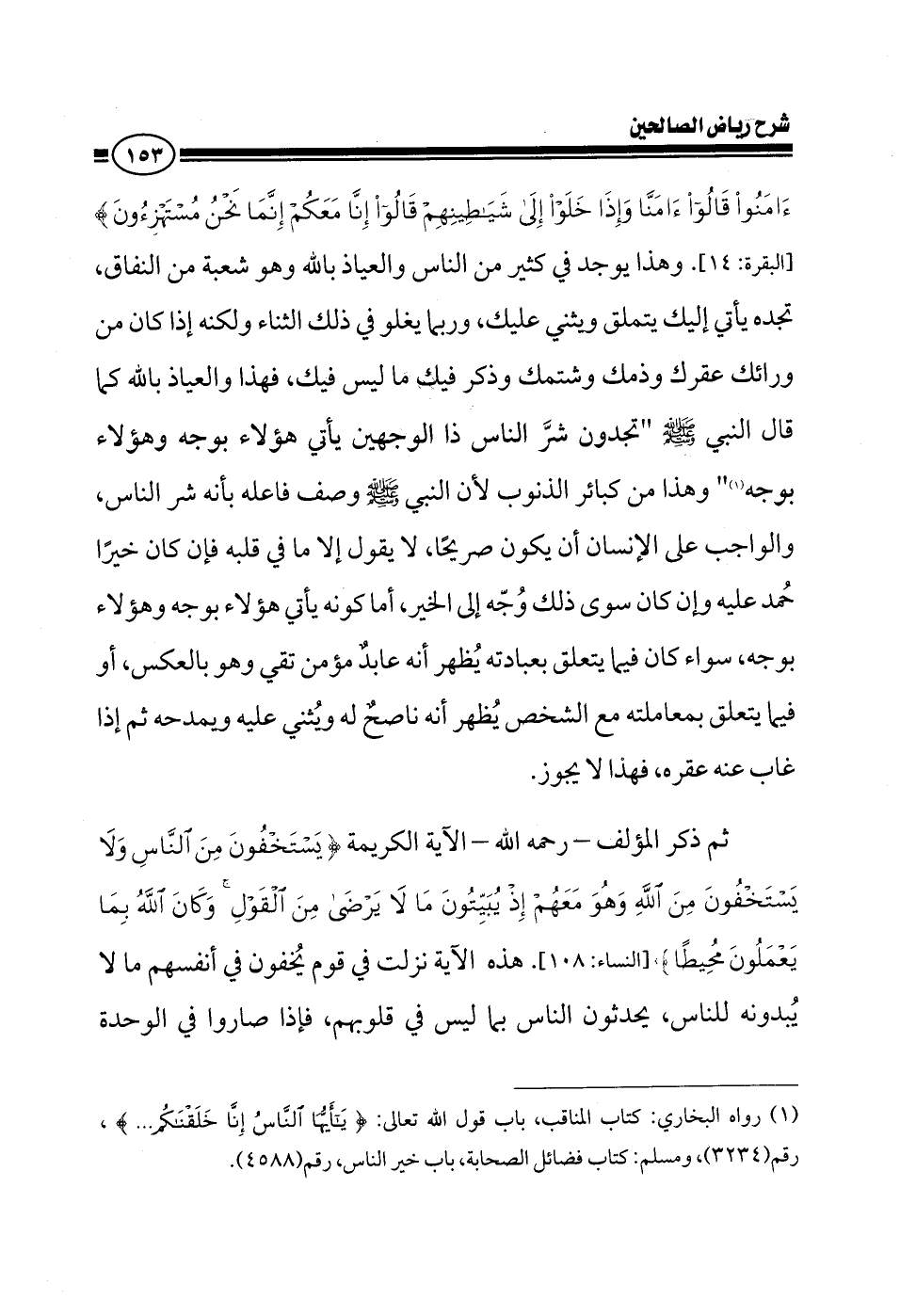 آمنوا قالوا آمنا وإذا خلوا إلى شياطينهم قالوا إنا معكم إنما نحن مستهزءون وهذا يوجد في كثير من الناس والعياذ بالله وهو شعبة من النفاق، تجده يأتي إليك يتملق ويثني عليك وربما يغلو في ذلك الثناء، ولكنه إذا كان من ورائك عقرك وذمك وشتمك وذكر فيك ما ليس فيك، فهذا والعياذ بالله كما قال النبي صلى الله عليه وسلم: تجدون شر الناس ذا الوجهين يأتي هؤلاء بوجه وهؤلاء بوجه وهذا من كبائر الذنوب؛ لأن النبي صلى الله عليه وسلم وصف فاعله بأنه شر الناس، والواجب على الإنسان أن يكون صريحًا، لا يقول إلا ما في قلبه فإن كان خيرًا حمد عليه وإن كان سوى ذلك وجه إلى الخير، أما كونه يأتي هؤلاء بوجه وهؤلاء بوجه، سواء كان فيما يتعلق بعبادته يظهر أنه عابد مؤمن تقي وهو بالعكس، أو فيما يتعلق بمعاملته مع الشخص؛ يظهر أنه ناصح له ويثني عليه ويمدحه ثم إذا غاب عنه عقره، فهذا لا يجوز.