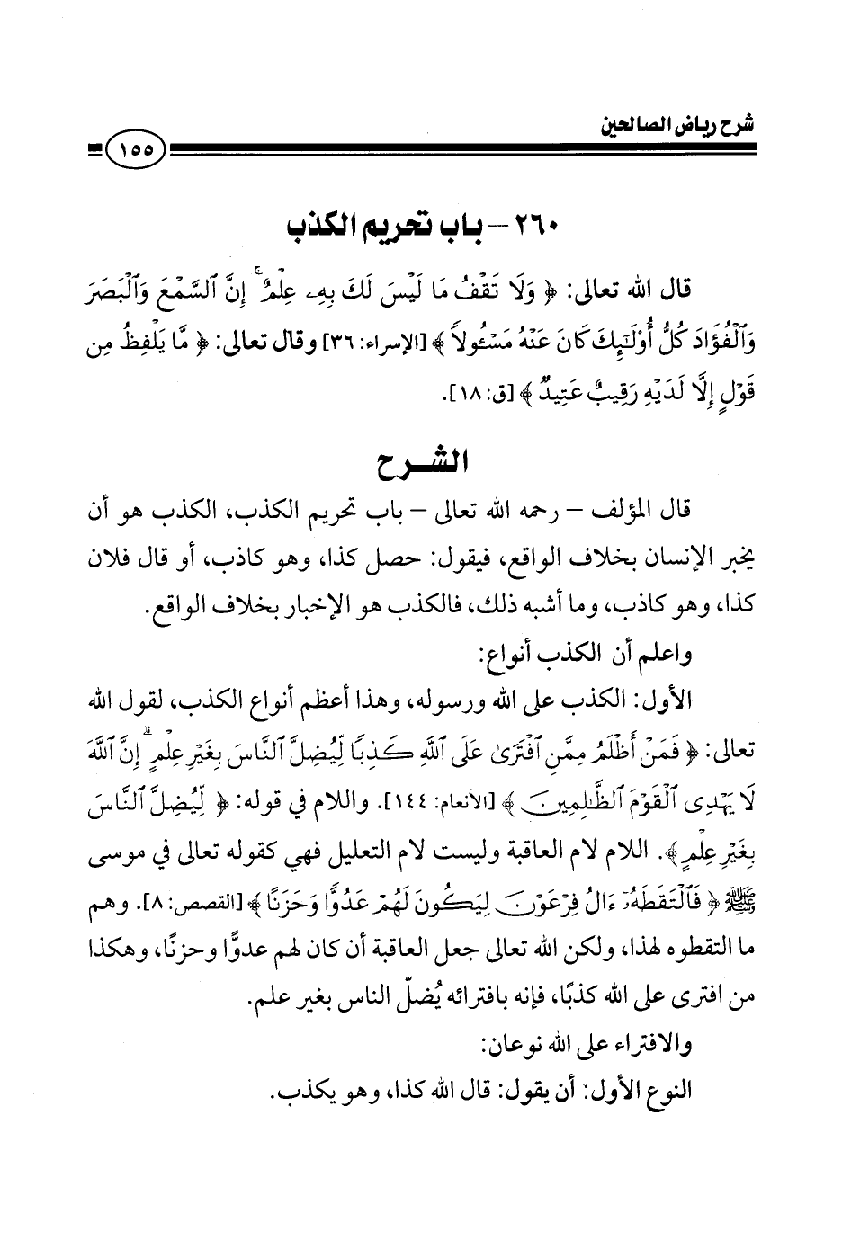 EXقال المؤلف النووي رحمه الله في كتابه (رياض الصالحين) باب تحريم الكذب، الكذب هو أن يخبر الإنسان بخلاف الواقع، فيقول: حصل كذا، وهو كاذب، أو قال فلان كذا، وهو كاذب وما أشبه ذلك، فهو الإخبار بخلاف الواقع.