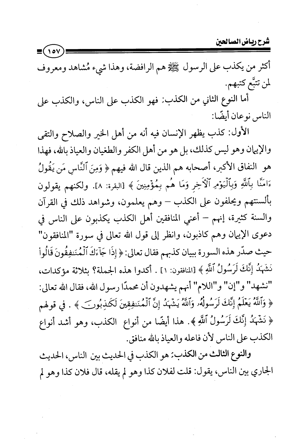 أما القسم الثاني من الكذب فهو الكذب على الناس، والكذب على الناس نوعان أيضًا: كذب يظهر الإنسان فيه أنه من أهل الخير والصلاح والتقى والإيمان وهو ليس كذلك، بل هو من أهل الكفر والطغيان والعياذ بالله، فهذا هو النفاق، النفاق الأكبر الذين قال الله فيهم: {ومن الناس من يقول آمنا بالله وباليوم الآخر وما هم بمؤمنين} لكنهم يقولون بألسنتهم ويحلفون على الكذب وهم يعلمون، وشواهد ذلك في القرآن والسنة كثيرة، إنهم - أعني المنافقين أهل الكذب يكذبون على الناس في دعوى الإيمان وهم كاذبون، وانظر إلى قول الله تعالى في سورة (المنافقون) حيث صدر هذه السورة ببيان كذبهم حيث قال تعالى: {إذا جاءك المنافقون قالوا نشهد إنك لرسول الله} أكدوا هذه الجملة بكم مؤكد؟ بثلاثة مؤكدات، (نشهد) (إن) (اللام) ثلاثة مؤكدات، يؤكدون أنهم يشهدون أن محمدًا رسول الله، فقال الله تعالى: {والله يعلم إنك لرسوله والله يشهد إن المنافقين لكاذبون} في قولهم (نشهد إنك لرسول الله) هذا أيضًا من أنواع الكذب، وهو أشد أنواع الكذب على الناس؛ لأن فاعله والعياذ بالله منافق.