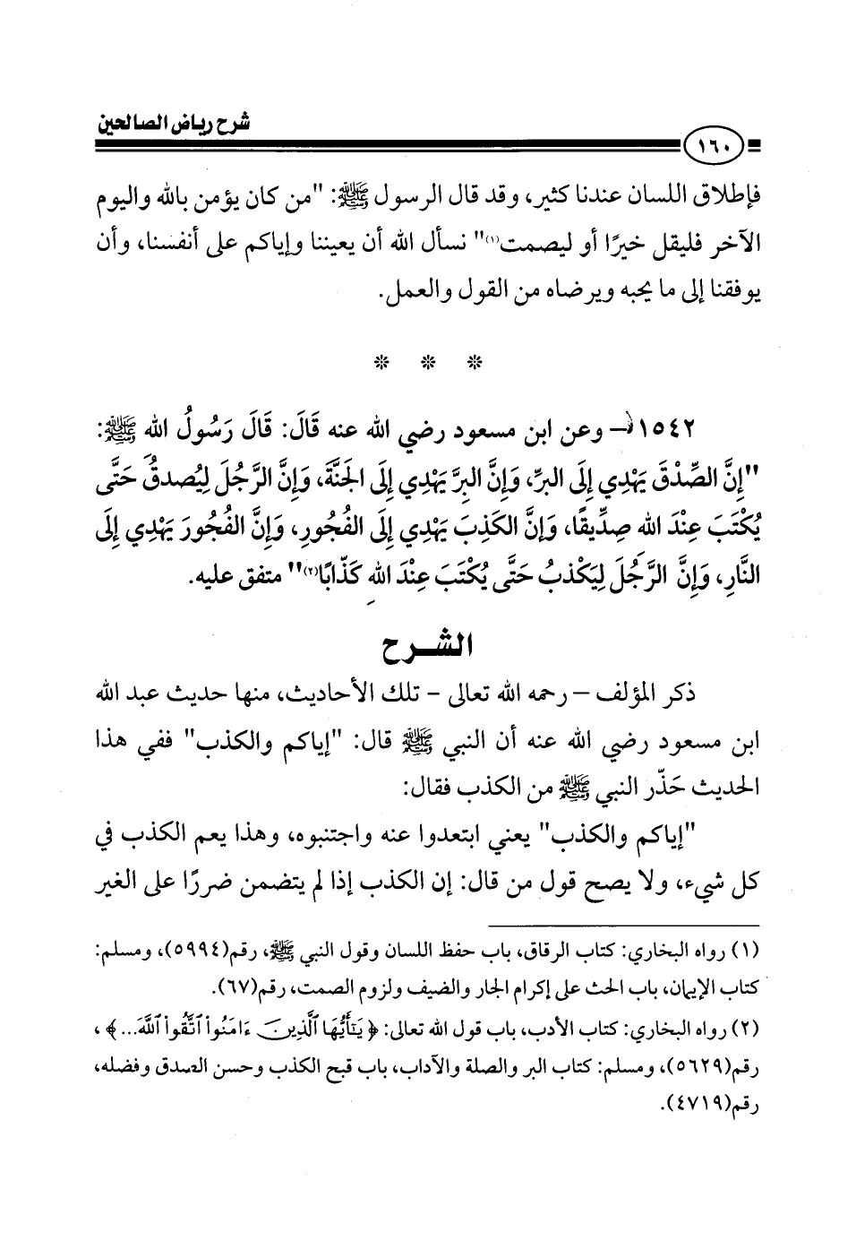 1542 - وعن ابن مسعود رضي الله عنه قال: قال رسول الله صلى الله عليه وسلم: إن الصدق يهدي إلى البر وإن البر يهدي إلى الجنة، وإن الرجل ليصدق حتى يكتب عند الله صديقًا، وإن الكذب يهدي إلى الفجور وإن الفجور يهدي إلى النار، وإن الرجل ليكذب حتى يكتب عند الله كذابًا متفق عليه.