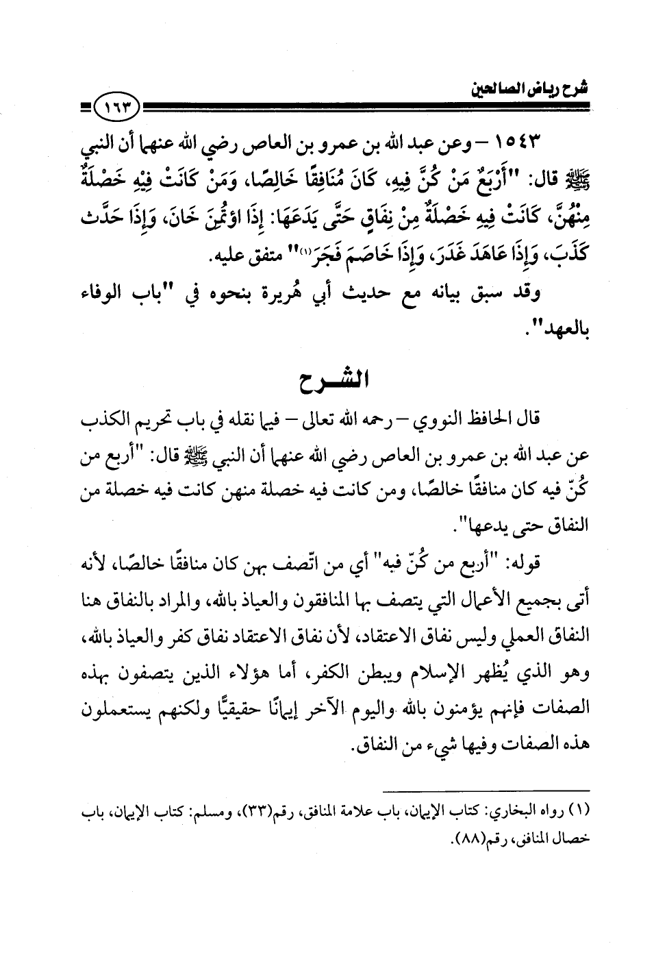 1543 - وعن عبد الله بن عمرو بن العاص رضي الله عنهما، أن النبي صلى الله عليه وسلم قال: أربع من كن فيه كان منافقًا خالصًا، ومن كانت فيه خصلة منهن، كانت فيه خصلة من نفاق حتى يدعها: إذا أؤتمن خان، وإذا حدث كذب، وإذا عاهد غدر، وإذا خاصم فجر.