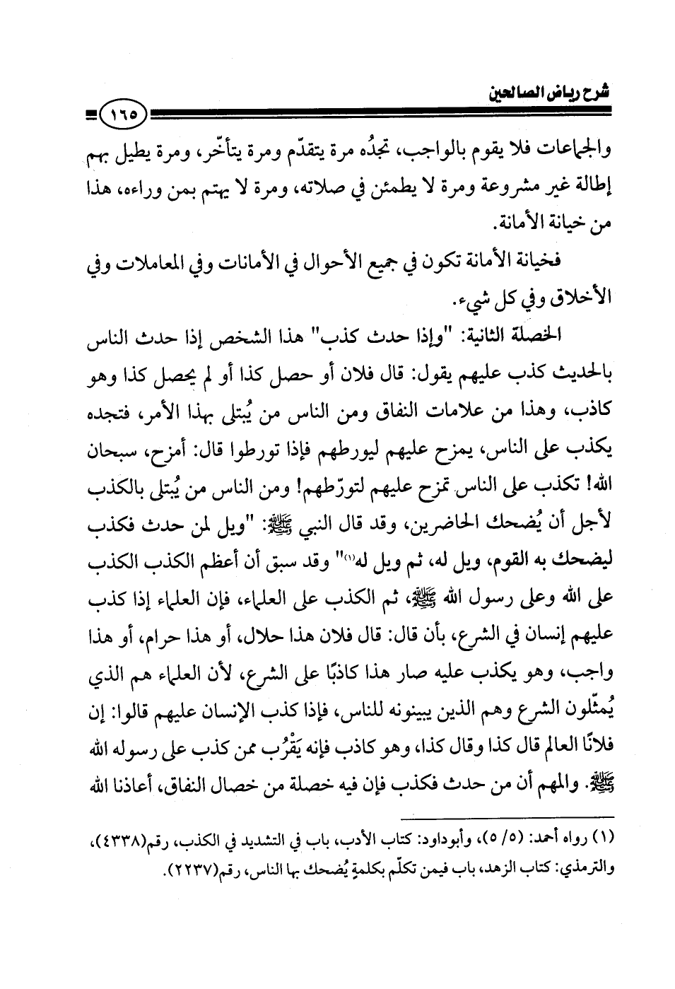 إذا ائتمن خان وإذا حدث كذب هذا الشخص إذا حدث الناس في الحديث قال فلان أو حصل كذا أو لم يحصل يكذب، هذا من علامات النفاق، ومن الناس من يفتن بهذا الأمر فتجده يكذب على الناس، يمزح عليهم ليورطهم فإذا تورطوا قال: أمزح، سبحان الله تكذب على الناس تمزح عليم لتورطهم! ومن الناس من يبتلى بالكذب لأجل أن يضحك الحاضرين، وقد قال النبي صلى الله عليه وسلم: ويل لمن حدث فكذب ليضحك به القوم، ويل له ثم ويل له وقد سبق أن أعظم الكذب الكذب على الله ورسوله صلى الله عليه وسلم ثم الكذب على العلماء؛ فإن العلماء إذا كذب عليهم إنسان في الشرع، بأن قال: قال فلان هذا حرام، أو هذا حلال، أو هذا واجب، وهو يكذب عليه صار هذا كاذبًا على الشرع؛ لأن العلماء هم الذين يمثلون الشرع وهم الذين يبينونه للناس، فإذا كذب الإنسان عليهم قالوا: إن فلاناً العالم قال كذا وقال كذا وهو كاذب فإنه يقرب ممن كذب على رسول الله صلى الله عليه وسلم.