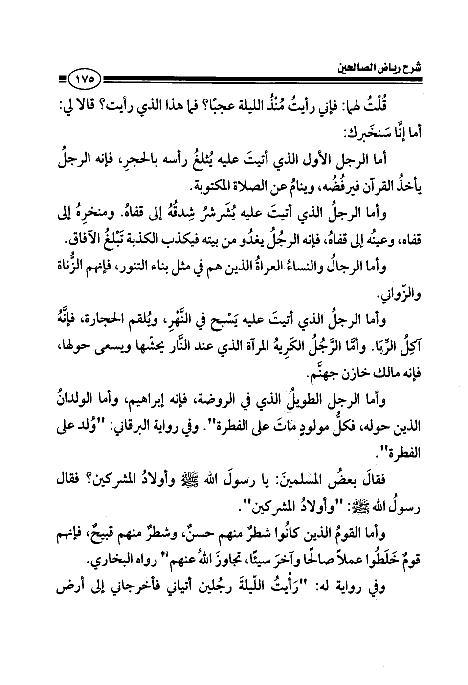 وأما الرجل الطويل الذي في الروضة، فإنه إبراهيم، وأما الولدان الذين حوله، فكل مولود مات على الفطرة وفي رواية البرقاني: ولد على الفطرة.