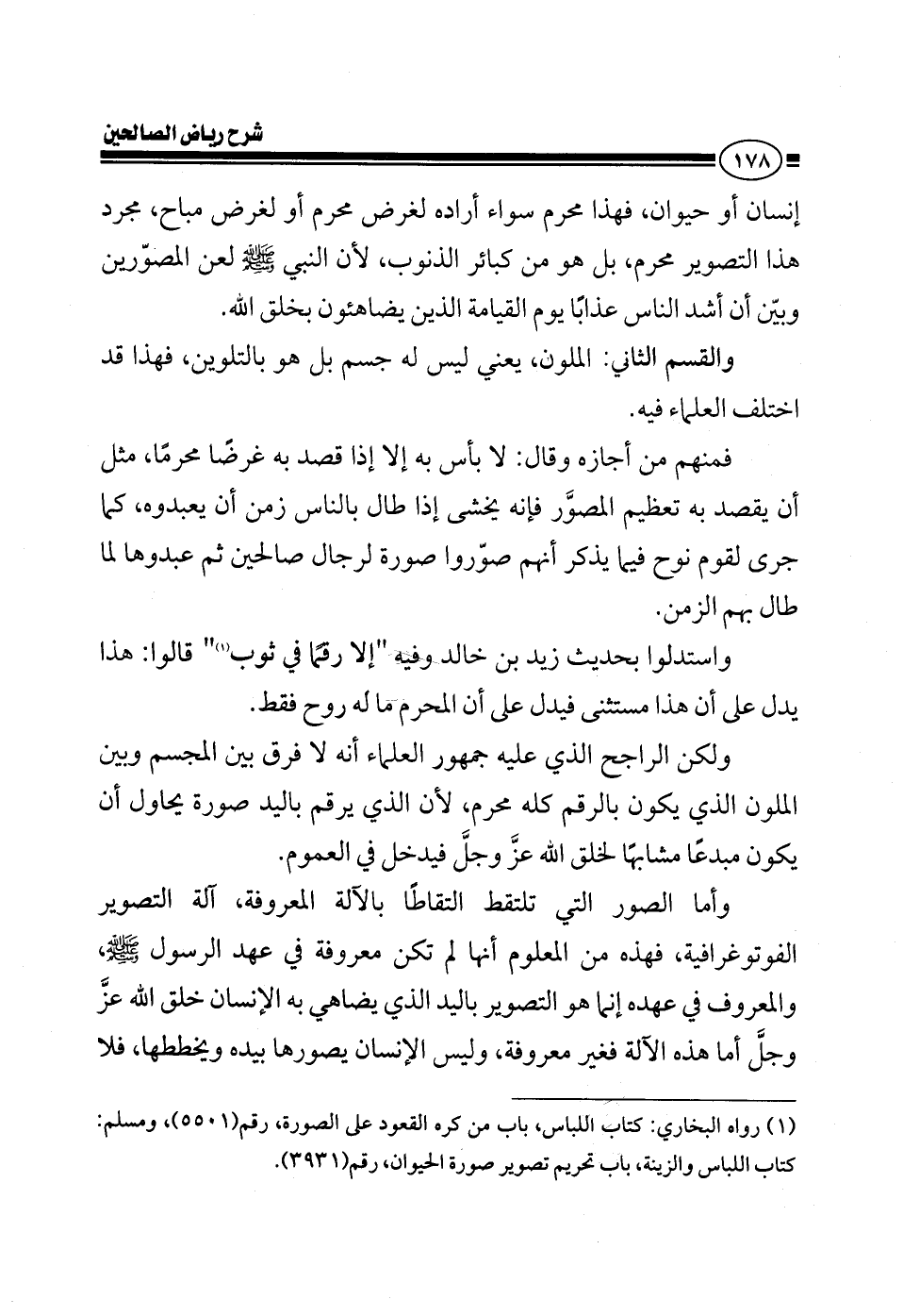 والقسم الثاني: الملون، يعني ليس له جسم بل هو بالتلوين، فهذا قد اختلف العلماء فيه فمنهم من أجاز وقال لا بأس به إلا إذا قصد به غرضا محرما مثل أن يقصد به التعظيم - تعظيم المصور - فإنه يخشى إذا طال بالناس زمن أن يعبدوه كما جرى لقوم نوح فيما يذكر أنهم صوروا صورة لرجال صالحين ثم عبدوها لما طال الزمن وقال بعض العلماء: إنه لا بأس به إذا كان ملونا واستدلوا بحديث زيد بن خالد وفيه: (إلا رقما في ثوب) قالوا: هذا يدل على أن هذا مستثنى فيدل على أن المحرم ما له روح فقط، ولكن الراجح الذي عليه جمهور العلماء أنه لا فرق بين المجسم وبين الملون الذي يكون بالرقم كله محرم؛ لأن الذي يرقم باليد صورة يحاول أن يكون مبدعا مشابها لخلق الله عز وجل فيدخل في العموم، وأما الصور التي تلتقط التقاطا بالآلة المعروفة، آلة التصوير الفوتوغرافية، فهذه من المعلوم أنها لم تكن معروفة في عهد الرسول صلى الله عليه وسلم، والمعروف في عهده إنما هو التصوير باليد الذي يضاهي به الإنسان خلق الله عز وجل أما هذه الآلة فغير معروفة، وليس الإنسان يصورها بيده ويخططها،