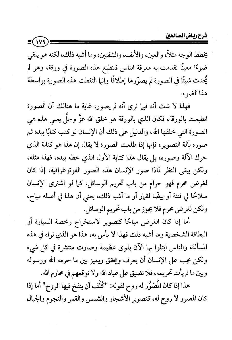 يخطط الوجه مثلا، والعينين، والأنف، والشفتين، وما أشبه ذلك لكنه هو يلقي ضوء معينا تقدمت به معرفة الناس فتنطبع هذه الصورة في ورقة، وهو لم يحدث شيئا في الصورة لم يصورها إطلاقا وإنما التقطت هذه الصورة بواسطة الضوء فهذا لا شك أنه فيما نرى أنه لم يصور، غاية ما هنالك أن الصورة طبعت بالورقة، فكان الذي بالورقة هو خلق الله عز وجل يعني هذه الصورة هي الصورة التي خلقها الله، والدليل على ذلك أن الإنسان لو كتب كتابا بيده ثم صوره بالآلة، آلة التصوير، فإنها إذا طلعت الصورة لا يقال إن هذا هو كتابة الذي حرك الآلة وصور (الشخص القائم بالتصوير) بل يقال هذا كتابة الأول الذي خطه بيده، فهذا مثله، ولكن يبقى النظر لماذا صور الإنسان هذه الصور الفوتوغرافية، إذا كان لغرض محرم فهو حرام من باب تحريم الوسائل، كما لو اشترى الإنسان سلاحا في فتنة أو بيضا لقمار أو ما أشبه ذلك، يعني أن هذا مباح ولكن لغرض محرم فلا يجوز من باب تحريم الوسائل، أما إذا كان الغرض مباحا كتصوير لاستخراج رخصة السيارة أو البطاقة الشخصية وما أشبه ذلك فهذا لا بأس به، هذا هو الذي نراه في هذه المسألة، والناس ابتلوا بها الآن بلوى عظيمة وصارت منتشرة في كل شيء، ولكن يجب على الإنسان أن يعرف ويحقق ويميز بين ما حرمه الله ورسوله وبين ما لم يأت تحريمه، فلا نضيق على عباد الله ولا نوقعهم في محارم الله هذا إذا كان المصور له روح لقوله (كلف أن ينفخ فيها الروح) أما إذا كان المصور لا روح له، كتصوير الأشجار والشمس والقمر والنجوم والجبال