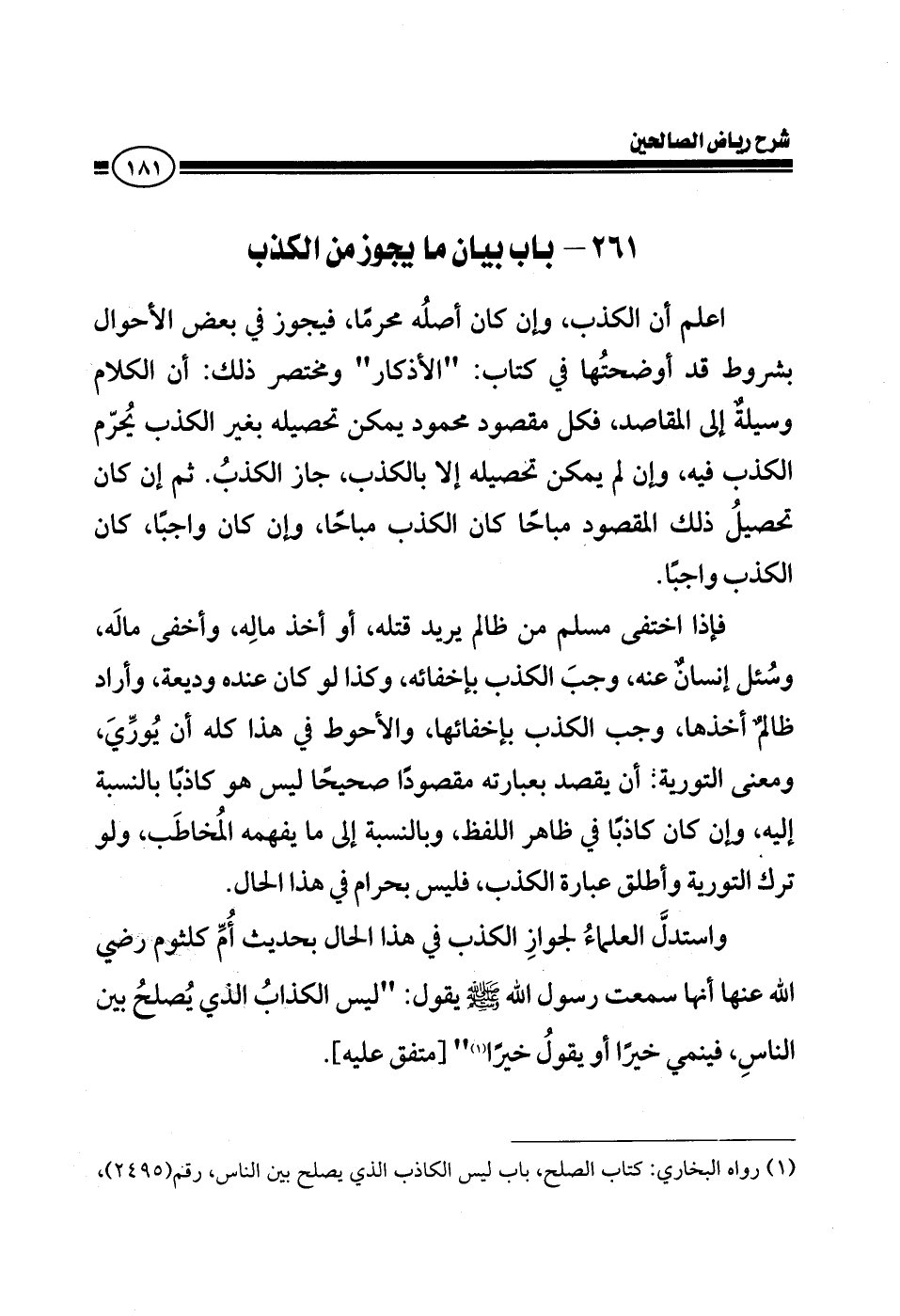 باب بيان ما يجوز من الكذب أعلم أن الكذب وإن كان أصله محرما، فيجوز في بعض الأحوال بشروط قد أوضحتها في كتاب الأذكار ومختصر ذلك أن الكلام وسيلة إلى المقاصد فكل مقصود محمود يمكن تحصيله بغير الكذب يحرم الكذب فيه وإن لم يمكن تحصيله إلا بالكذب جاز الكذب ثم إن كان تحصيل ذلك المقصود مباحا كان الكذب مباحا وإن كان واجبا كان الكذب واجبا فإذا اختفى مسلم من ظالم يريد قتله أو أخذ ماله وأخفى ماله وسئل إنسان عنه وجب الكذب بإخفائه، وكذا لو كان عنده وديعة، وأراد ظالم أخذها وجب الكذب بإخفائها والأحوط في هذا كله أن يوري ومعنى التورية: أن يقصد بعبارته مقصودا صحيحا ليس هو كاذبا بالنسبة إليه وإن كان كاذبا في ظاهر اللفظ وبالنسبة إلى ما يفهمه المخاطب ولو ترك التورية وأطلق عبارة الكذب فليس بحرام في هذا الحال واستدل العلماء بجواز الكذب في هذا الحال بحديث أم كلثوم رضي الله عنها أنها سمعت رسول الله صلى الله عليه وسلم يقول: ليس الكذاب الذي يصلح بين الناس فينمي خيرا أو يقول خيرا متفق عليه.