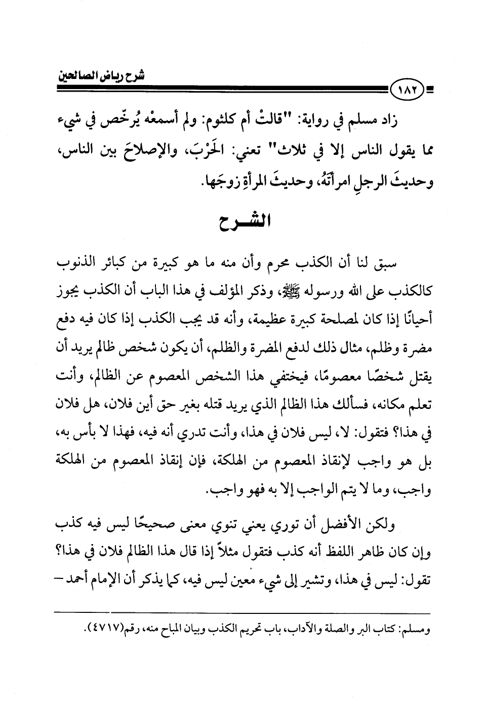 زاد مسلم في رواية: قالت أم كلثوم: ولم أسمعه يرخص في شيء مما يقول الناس إلا في ثلاث: تعني الحرب، والإصلاح بين الناس وحديث الرجل امرأته، وحديث المرأة زوجها.