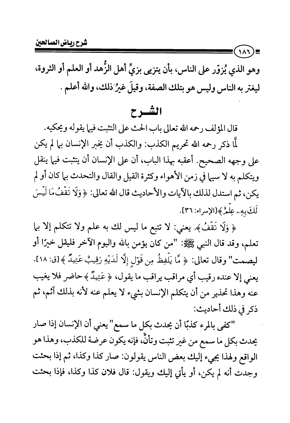 EXقال المؤلف رحمه الله تعالى في كتابه (رياض الصالحين) باب التثبت فيما يقول وما يتكلم به - لما ذكر رحمه الله تحريم الكذب - والكذب أن يخبر الإنسان بما لم يكن على وجهه الصحيح أعقبه بهذا الباب، أن الإنسان يتثبت فيما ينقل ويتكلم به، لاسيما في زمن الأهواء وكثرة القيل والقال والتحدث بما كان أو لم يكن، ثم استدل لذلك بالآيات والأحاديث قال الله تعالى: ولا تقف ما ليس لك به علم (لا تقف) يعني لا تتبع ما ليس لك به علم ولا تتكلم إلا بما تعلم وقد قال النبي صلى الله عليه وسلم: من كان يؤمن بالله واليوم الآخر فليقل خيرا أو ليصمت، قال تعالى: {ما يلفظ من قول إلا لديه رقيب عتيد} يعني إلا عنده رقيب أي مراقب يراقب ما تقول، عتيد حاضر فلا يغيب عنه، وهذا تحذير من أن يتكلم الإنسان بشيء لا يعلم عنه، لأنه بذلك آثم ثم ذكر في ذلك أحاديث: كفى بالمرء كذبا أن يحدث بكل ما سمع يعني أن الإنسان إذا صار يحدث بكل ما سمع من غير تثبت وتأن، فإنه يكون عرضة للكذب، وهذا هو الواقع ولهذا يجيء إليك بعض الناس يقولون: صار كذا وكذا، ثم إذا بحثت وجدت أنه لم يكن، أو يأتي إليك ويقول: قال فلان كذا وكذا، فإذا بحثت
