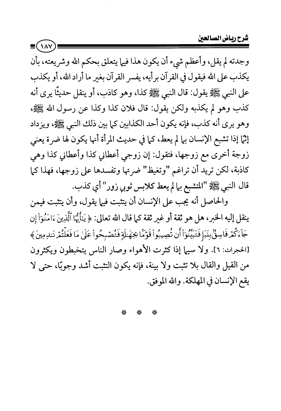 والحاصل أنه يجب على الإنسان أن يتثبت فيما يقول ويتثبت فيمن ينقل إليه الخبر، هل هو ثقة، أو غير ثقة كما قال الله تعالى: {يا أيها الذين آمنوا إن جاءكم فاسق بنبأ فتبينوا أن تصيبوا قوما بجهالة فتصبحوا على ما فعلتم نادمين} ولاسيما إذا كثرت الأهواء وصار الناس يتخبطون ويكثرون من القيل والقال بلا تثبت ولا بينة، فإنه يكون التثبت أشد وجوبا، حتى لا يقع الإنسان في المهلكة.