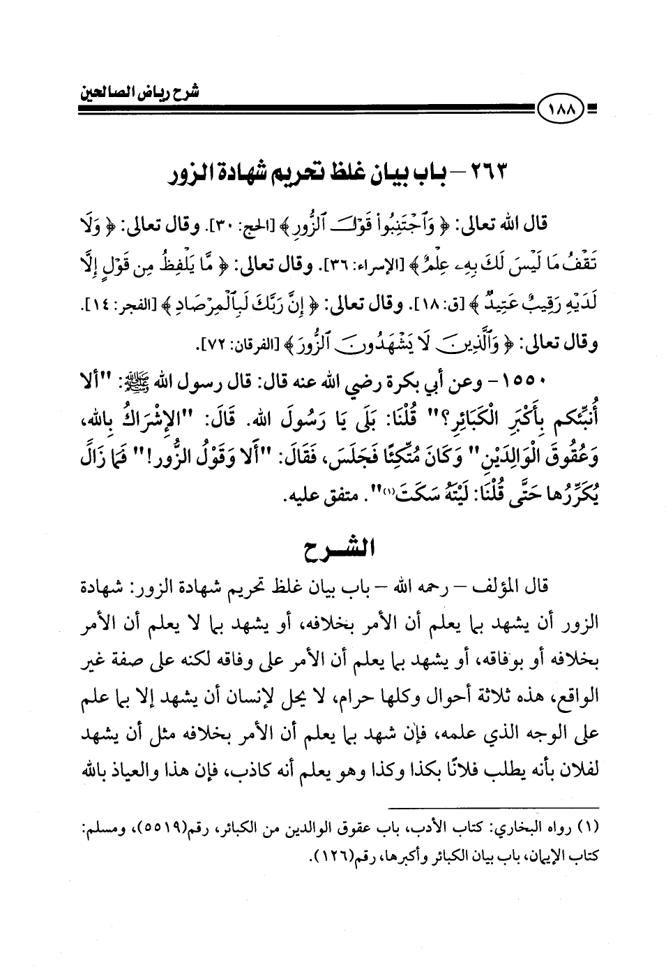 EXقال المؤلف رحمه الله تعالى في كتابه (رياض الصالحين) باب تغليظ تحريم شهادة الزور، شهادة الزور أن يشهد بما يعلم أن الأمر بخلافة، أو يشهد بما لا يعلم أن الأمر بخلافه أو بوفاقه، أو يشهد بما يعلم أن الأمر على وفاقه لكنه على صفة غير الواقع، هذه ثلاثة أحوال وكلها حرام، لا يحل لإنسان أن يشهد إلا بما علم على الوجه الذي علمه، فإن شهد بما يعلم أن الأمر بخلافه مثل أن يشهد لفلان بأنه يطلب فلانا كذا وكذا وهو يعلم أنه كاذب، فإن هذا والعياذ بالله
