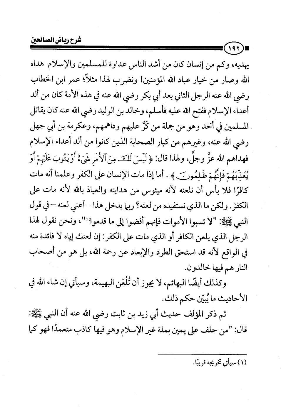 ولكن ما الذي نستفيده من لعنه ربما يدخل هذا - أعني لعنه - في قول النبي صلى الله عليه وسلم: لا تسبوا الأموات فإنهم أفضوا إلى ما قدموا ونحن نقول لهذا الرجل الذي يلعن الكافر أو الذي مات على الكفر نقول: إن لعنك إياه لا فائدة منه في الواقع، لأنه قد استحق الطرد والإبعاد عن رحمة الله، فليس من أهل رحمة الله أبدا، بل هو من أصحاب النار هم فيها خالدون وكذلك أيضا البهائم لا يجوز أن تلعن البهيمة: البعير، الحمار، بقرة، شاة، لا يجوز أن تلعنه، وسيأتي إن شاء الله في الأحاديث ما يبين حكم ذلك.