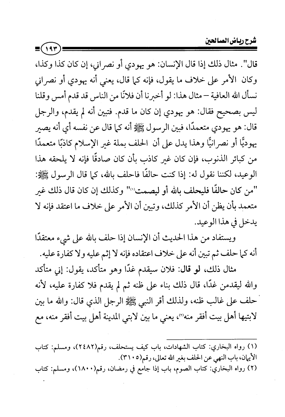قال مثال ذلك إذا قال الإنسان: هو يهودي أو نصراني إن كان كذا وكذا وكان الأمر على خلاف ما يقول فإنه كما قال، يعني أنه يهودي أو نصراني - نسأل الله العافية - مثال هذا أخبرنا رجل جاء إلينا وقال: إنه قدم فلان أمس قلنا ما هو صحيح قال هو يهودي إن كان ما قدم فتبين أنه لم يقدم والرجل قال: هو يهودي متعمدا، فبين الرسول صلى الله عليه وسلم أنه كما قال عن نفسه أي أنه يصير يهوديا أو نصرانيا وهذا يدل على أن الحلف بمله غير الإسلام كاذبا متعمدا من كبائر الذنوب، فإن كان غير كاذب بأن كان صادقا فإنه لا يلحقه هذا الوعيد، لكننا نقول له إذا كنت حالفا فاحلف بالله كما قال الرسول صلى الله عليه وسلم: من كان حالفا فليحلف بالله أو ليسكت وكذلك إن كان قال ذلك غير متعمد بأن يظن أن الأمر كذلك، وتبين أن الأمر على خلاف ما اعتقد فإنه لا يدخل في هذا الوعيد، ويستفاد من هذا الحديث أن الإنسان إذا حلف بالله على شيء معتقدا أنه كما حلف ثم تبين أنه على خلاف اعتقاده فإنه لا إثم عليه ولا كفارة عليه، مثال ذلك: لو قال: فلان سيقدم غدا متأكد يقول: إني متأكد والله ليقدمن غدا، قال ذلك بناء على ظنه ثم لم يقدم فلا كفارة عليه لأنه حلف على ظنه غير متعمد، ولذلك أقر النبي صلى الله عليه وسلم الرجل الذي قال: والله ما بين لابتيها أهل بيت أفقر منه يعني ما بين لابتي المدينة أهل بيت أفقر منه، مع