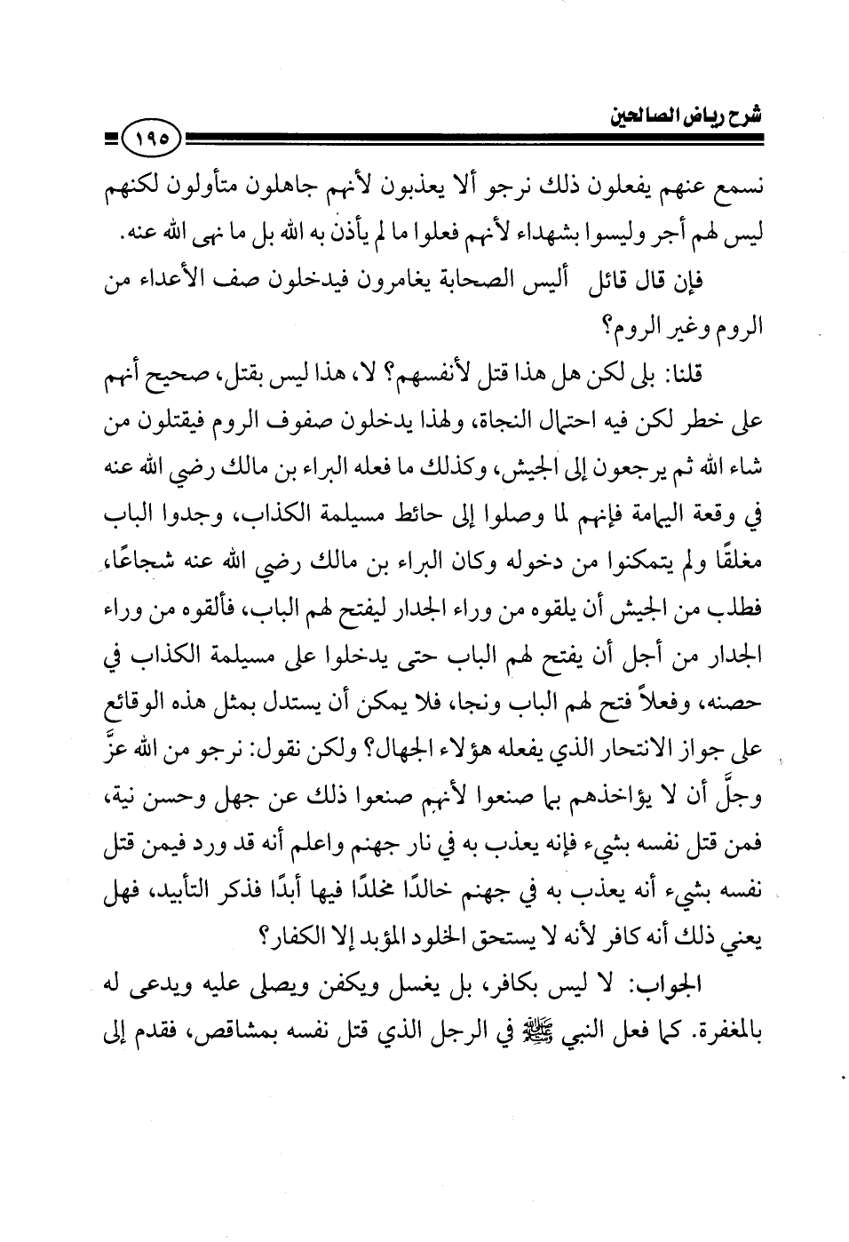 نسمع عنهم يفعلون ذلك نرجو ألا يعذبوا لأنهم جاهلون متأولون لكنهم ليس لهم أجر وليسوا بشهداء لأنهم فعلوا ما لم يأذن به الله بل ما نهى الله عنه فإن قال قائل: أليس الصحابة يغامرون فيدخلون صف الأعداء من الروم وغير الروم، قلنا بلى لكن هل هذا قتل لأنفسهم، ليس بقتل صحيح أنهم على خطر لكن فيه احتمال النجاة ولهذا يدخلون صفوف الروم فيقتلون من شاء الله ثم يرجعون إلى الجيش وكذلك ما فعله البراء بن مالك رضي الله عنه في وقعة اليمامة فإنهم لما وصلوا إلى حائط مسيلمة الكذاب وجدوا الباب مغلقا ولم يتمكنوا من دخوله وكان البراء بن مالك رضي الله عنه أخا أنس بن مالك كان شجاعا فطلب من الجيش أن يلقوه من وراء الجدار ليفتح لهم الباب فألقوه من وراء الجدار من أجل أن يفتح لهم الباب ففعلوا حتى يدخلوا على مسيلمة الكذاب وفعلا فتح لهم الباب ونجا فلا يمكن أن نستدل بمثل هذه الوقائع على جواز الانتحار الذي يفعله هؤلاء من سلطان ولكن نقول نرجو من الله عز وجل أن لا يأخذهم بما صنعوا لأنهم صنعوا ذلك عن جهل وحسن نية فمن قتل نفسه بشيء فإنه يعذب به في نار جهنم واعلم أنه قد ورد فيمن قتل نفسه بشيء أنه يعذب به في جهنم خالدا مخلدا فيها أبدا فذكر التأبيد فهل يعني ذلك أنه كافر ? لأنه لا يستحق الخلود المؤبد إلا الكفار الجواب: لا ليس بكافر ? بل يغسل ويكفن ويصلى عليه ويدعى له بالمغفرة كما فعل النبي صلى الله عليه وسلم في الرجل الذي قتل نفسه بمشاقص ? فقدم إلى
