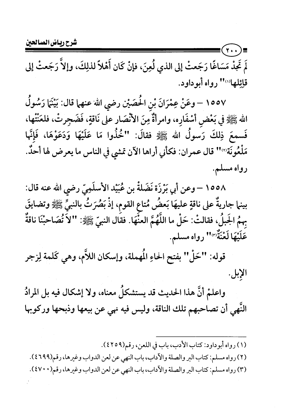 1558 - وعن أبي برزة نضلة بن عبيد الأسلمي رضي الله عنه قال: بينما جارية على ناقة عليها بعض متاع القوم إذ بصرت بالنبي صلى الله عليه وسلم وتضايق بهم الجبل فقالت: حل اللهم العنها فقال النبي صلى الله عليه وسلم: لا تصاحبنا ناقة عليها لعنة رواه مسلم قوله: حل بفتح الحاء المهملة، وإسكان اللام وهي كلمة لزجر الإبل واعلم أن هذا الحديث قد يستشكل معناه ولا إشكال فيه بل المراد النهي أن تصاحبهم تلك الناقة وليس فيه نهي عن بيعها وذبحها وركوبها