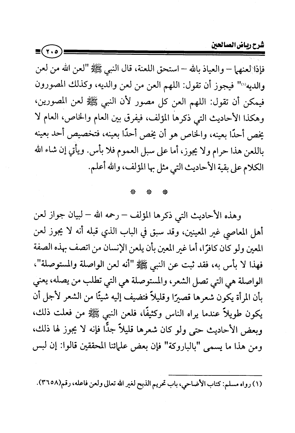EXهذه الأحاديث التي عقدها المؤلف رحمه الله لبيان جواز لعن أهل المعاصي غير المعينين وقد سبق في الباب الذي قبله أنه لا يجوز لعن المعين ولو كان كافرا أما غير المعين بأن يلعن الإنسان من اتصف بهذه الصفة فهذا لا بأس به فقد ثبت عن النبي صلى الله عليه وسلم أنه لعن الواصلة والمستوصلة الواصلة هي التي تصل الشعر والمستوصلة هي التي تطلب من يصله يعني بأن المرأة يكون رأسها قصيرا وشعرها قليلا فتضيف إلى رأسها شيئا من الشعر لأجل أن يكون طويلا عندما يراه الناس وكثيفا فلعن النبي صلى الله عليه وسلم من فعل ذلك وبعض الأحاديث حتى ولو كان شعرها قليلا جدا فإنه لا يجوز لها ذلك ومن هذا ما يسمى بالباروكة فأن بعض علمائنا المحققين قالوا إن لبس