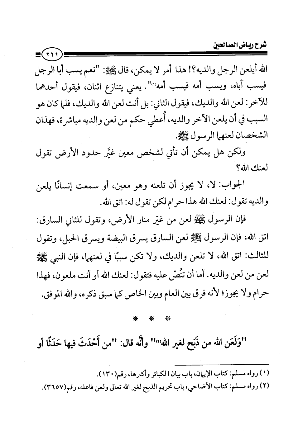 الله أيلعن الرجل والديه هذا أمر لا يمكن قال: نعم يسب أبا الرجل فيسب أباه ويسب أمه فيسب أمه يعني يتنازع اثنان فيقول أحدهما للآخر لعن الله والديك فيقول الثاني بل أنت لعن الله والديك فلما كان هو السبب في أن يلعن الآخر والديه أعطى حكم من لعن والديه مباشرة فهذان الشخصان لعنهما الرسول صلى الله عليه وسلم ولكن هل يمكن أن تأتي لشخص معين غير حدود الأرض تقول لعنك الله الجواب لا لا يجوز أن تلعنه وهو معين أو سمعت إنسانا يلعن والديه تقول لعنك الله لا يصح هذا حرام لكن تقول له اتق الله فإن الرسول صلى الله عليه وسلم لعن من غير منار الأرض وتقول للثاني السارق اتق الله فإن الرسول صلى الله عليه وسلم لعن السارق يسرق البيضة ويسرق الحبل وتقول للثالث اتق الله لا تلعن والديك ولا تكن سببا في لعنهما فإن النبي صلى الله عليه وسلم لعن من لعن والديه أما أن تنص عليه فتقول لعنك الله أو أنت ملعون فهذا حرام ولا يجوز لأنه فرق بين العام وبين الخاص والله الموفق