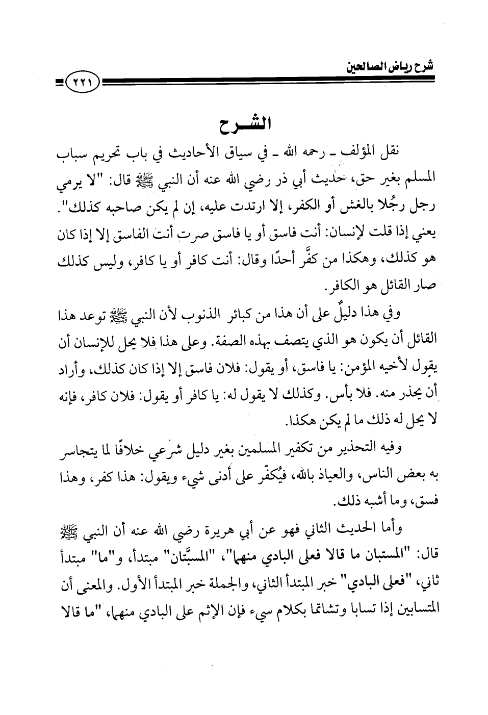 EXقال النووي رحمه الله تعالى في كتابه رياض الصالحين في باب تحريم سباب المسلم بغير حق عن أبي ذر رضي الله عنه أن النبي صلى الله عليه وسلم قال: من دعى أخاه بكفر أو فسق عاد عليه ما لم يكن صاحبه كذلك يعني إذا قلت لإنسان أنت فاسق أو يا فاسق صرت أنت الفاسق إلا إذا كان هو كذلك وهكذا من كفر أحدا وقال أنت كافر أو يا كافر وليس كذلك صار القائل هو الكافر وفي هذا دليل على أن هذا من كبائر الذنوب لأن النبي صلى الله عليه وسلم توعد هذا القائل أن يكون هو الذي يتصف بهذه الصفة وعلى هذا فلا يحل للإنسان أن يقول لأخيه المؤمن يا فاسق أو يقول فلان فاسق إلا إذا كان كذلك وأراد أن يحذر منه فلا بأس وكذلك لا يقول له يا كافر أو يقول فلان كافر فإنه لا يحل له ذلك ما لم يكن هكذا وفيه التحذير من تكفير المسلمين بغير دليل شرعي خلافا لما يتجاسر به بعض الناس والعياذ بالله يكفر على أدنى شيء يقول هذا كفر وهذا فسق وما أشبه ذلك وأما الحديث الثاني فهو عن أبي هريرة رضي الله عنه أن النبي صلى الله عليه وسلم قال: المتسابان ما قالا فعلى البادي منهما المتسابان مبتدأ ما مبتدأ ثاني فعلى البادي خبر المبتدأ الثاني والجملة خبر المبتدأ الأول والمعنى أن المتسابان إذا تسابا وتشاتما بكلام سيئ فإن الإثم على البادي منهما ما قالا