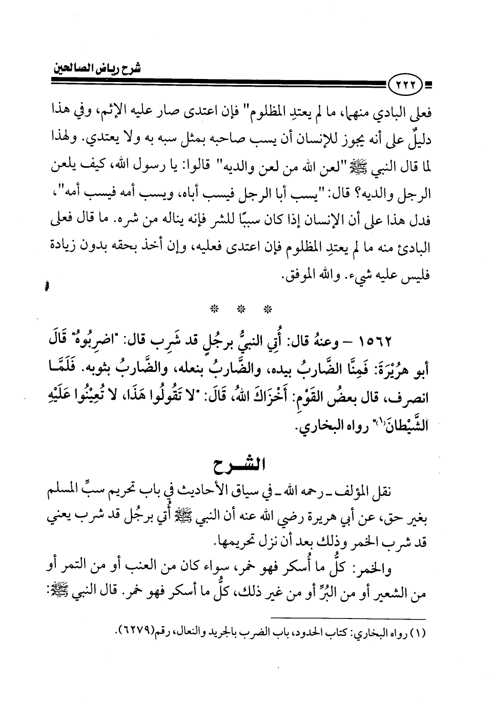 EXهذه بقية الأحاديث في باب تحريم سب المسلم بغير حق وقد سبق حديثان حديث ابن مسعود وحديث أبي هريرة رضي الله عنهما في هذا الموضوع أما الحديث الثالث فهو عن أبي هريرة رضي الله عنه أن النبي صلى الله عليه وسلم أتى برجل قد شرب يعني قد شرب الخمر وذلك بعد أن نزل تحريمها والخمر كل ما أسكر فهو خمر سواء كان من العنب أو من التمر أو من الشعير أو من البر أو من غير ذلك كل ما أسكر فهو خمر قال النبي صلى الله عليه وسلم: