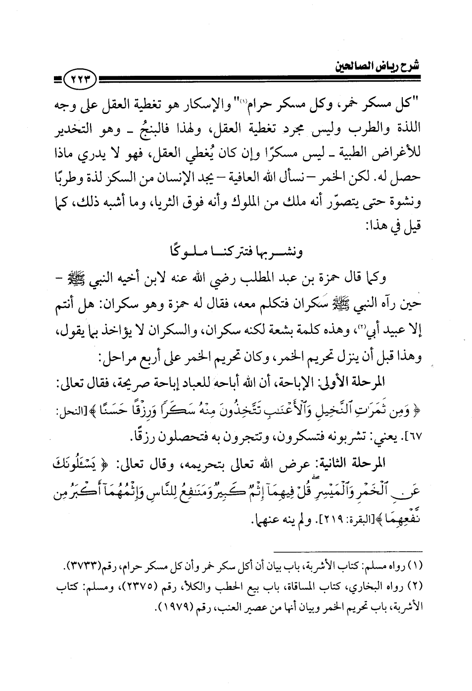 وكما قال حمزة بن عبد المطلب رضي الله عنه لابن أخيه النبي صلى الله عليه وسلم حين رآه النبي صلى الله عليه وسلم سكران فتكلم معه فقال له حمزة وهو سكران هل أنتم إلا عبيد أبي وهذه كلمة بشعة لكنه سكران والسكران لا يؤاخذ بما يقول وهذا قبل أن ينزل تحريم الخمر وكان الخمر على أربع مراحل: المرحلة الأولى إباحة أن الله أباحه للعباد إباحة طيبة فقال تعالى: ومن ثمرات النخيل والأعناب تتخذون منه سكرا ورزقا حسنا يعني تشربونه فتسكرون وتتجرون به فتحصلون رزقا المرحلة الثانية تعريض الله تعالى بتحريمه وقال تعالى: {يسألونك عن الخمر والميسر قل فيهما إثم كبير ومنافع للناس وإثمهما أكبر من نفعهما} ولم ينه عنهما