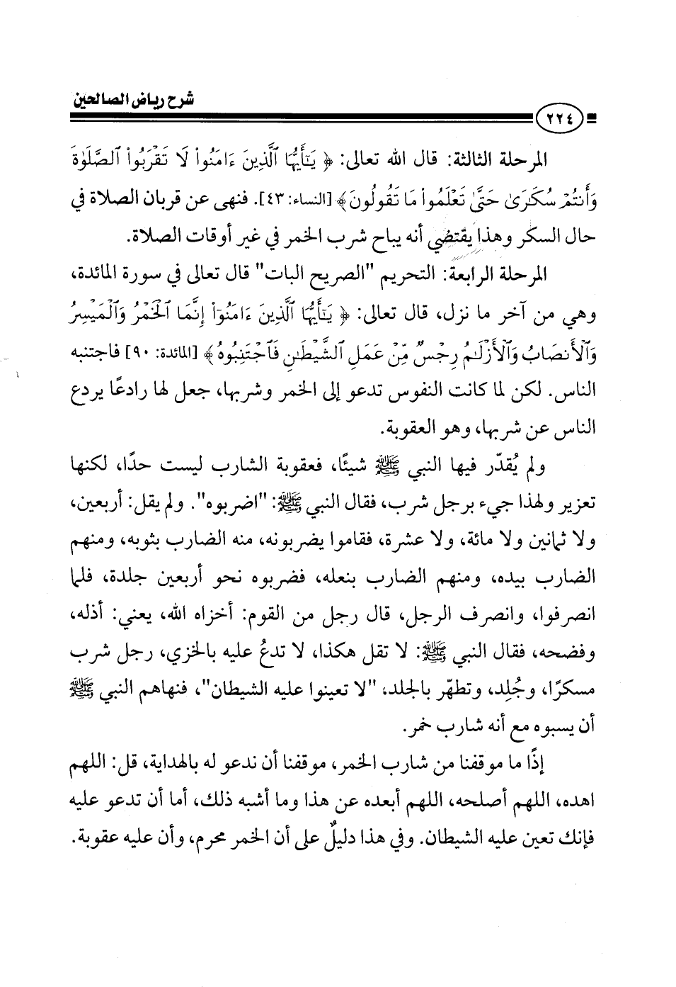 في هذه المرحلة الثانية المرحلة الثالثة قال الله تعالى: {يا أيها الذين آمنوا لا تقربوا الصلاة وأنتم سكارى حتى تعلموا ما تقولون} فنهى عن قربان الصلاة في حال السكر وهذا يقتضي أنه يباح شرب الخمر في غير أوقات الصلاة المرحلة الرابعة: التحريم البائن قال تعالى في سورة المائدة وهي من آخر ما نزل قال تعالى: {يا أيها الذين آمنوا إنما الخمر والميسر والأنصاب والازلام رجس من عمل الشيطان فاجتنبوه} فاجتنبه الناس لكن لما كانت النفوس تدعوا إليها إلى الخمر وشربها جعل لها رادع يردع الناس عن شربها وهو العقوبة ولم يقدر لها النبي صلى الله عليه وسلم شيئا فعقوبة الشارب ليست حدا لكنها تعزير ولهذا جيء برجل شرب الخمر فقال النبي صلى الله عليه وسلم اضربوه ولا قال أربعين ولا ثمانين ولا مائة ولا عشرة فقاموا يضربونه منه الضارب بثوبه ومنهم الضارب بيده ومنهم الضارب بنعله لكن ضربوه نحو أربعين جلدة فلما انصرفوا وانصرف الرجل قال رجل من القوم: أخزاه الله يعني أذله وفضحه فقال النبي صلى الله عليه وسلم لا تقل هكذا لا تدع عليه بالخزي رجل شرب مسكرا وجلد وتطهر بالجلد لا تعينوا عليه الشيطان فنهاهم النبي صلى الله عليه وسلم أن يسبوه مع أنه شارب خمر إذا ما موقفنا من شارب الخمر موقفنا أن ندعوا له بالهداية قل اللهم اهده اللهم أصلحه اللهم أبعده عن هذا وما أشبه ذلك أما أن تدعوا عليه فإنك تعين عليه الشيطان وفي هذا دليل على أن الخمر محرم وأن عليه عقوبة