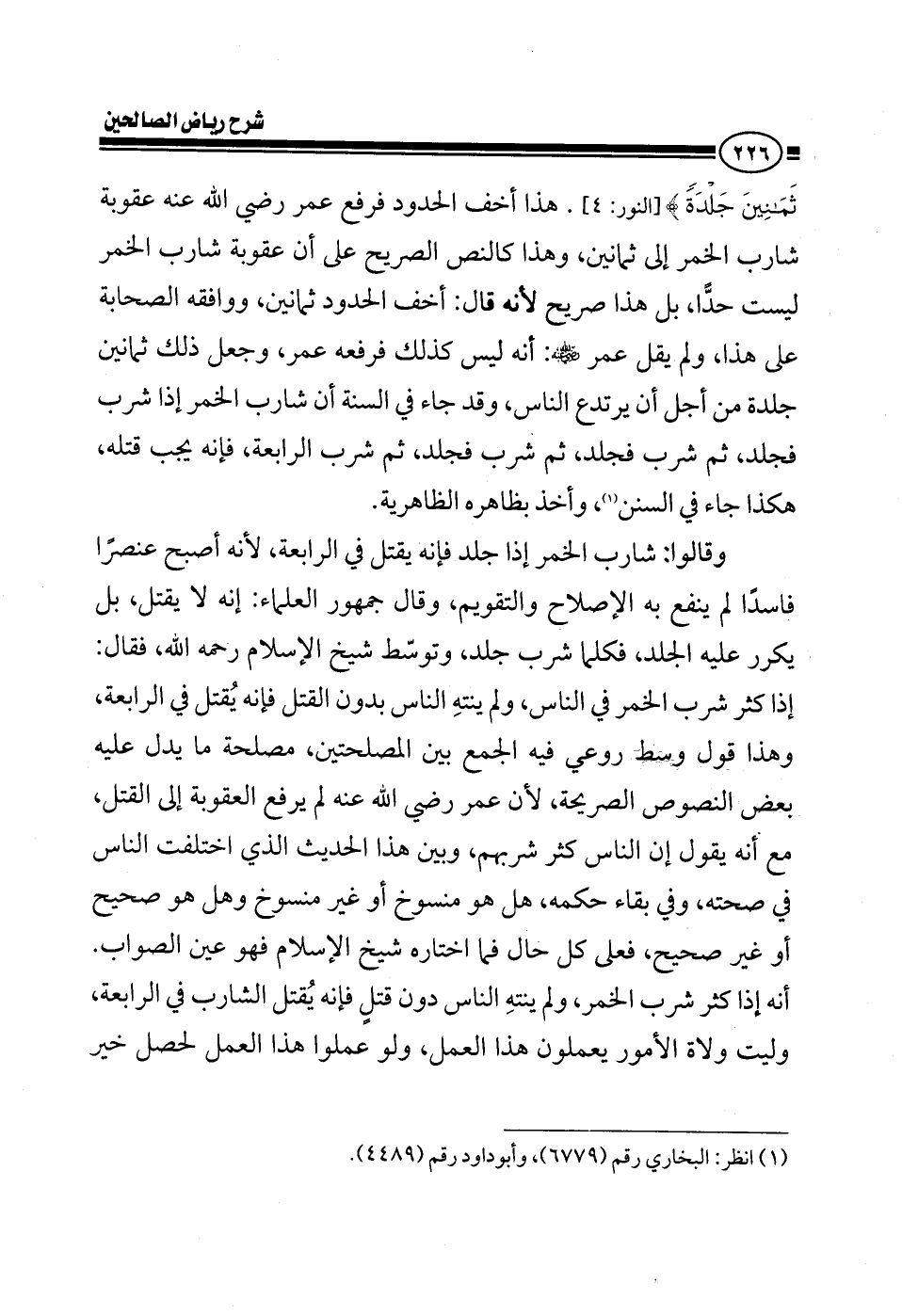 ثمانين جلده} هذا أخف الحدود فرجع عمر رضي الله عنه عقوبة شارب الخمر إلى ثمانين وهذا كالنص الصريح على أن عقوبة شارب الخمر ليست حدا بل هي صريح لأنه قال: أخف الحدود ثمانين ووافقه الصحابة على هذا ولم يقل عمر رضي الله عنه: أنه ليس كذلك فرفعه عمر وجعل ذلك ثمانين جلدة من أجل أن يرتدع الناس وقد جاء في السنة أن شارب الخمر إذا شرب فجلد ثم شرب فجلد ثم شرب فجلد ثم شرب الرابعة فإنه يجب قتله هكذا جاء في السنة وأخذ بظاهره الظاهرية وقالوا شارب الخمر إذا جلد فإنه يقتل في الرابعة لأنه أصبح عنصرا فاسدا لم ينفع فيه الإصلاح والتقويم وقال جمهور العلماء لا يقتل بل يكرر عليه الجلد كلما شرب جلد وتوسط شيخ الإسلام رحمه الله فقال: إذا كثر شرب الخمر في الناس ولم ينته الناس بدون القتل فإنه يقتل في الرابعة وهذا قول وسط روعي فيه الجمع بين المصلحتين مصلحة ما يدل عليه بعض النصوص الصريحة لأن عمر لم يرفع العقوبة إلى القتل مع أنه يقول إن الناس كثر شربهم وبين هذا الحديث الذي اختلفت الناس في صحته وفي بقاء حكمه هل هو منسوخ أو غير منسوخ وهل هو صحيح أو غير صحيح فعلى كل حال فالذي اختاره شيخ الإسلام هو عين الصواب أنه إذا كثر شرب الناس والخمر ولم ينته الناس بدون قتل فإنه يقتل الشارب في الرابعة وليت ولاة الأمور يعملون هذا العمل ولو عملوا هذا العمل لحصل خير