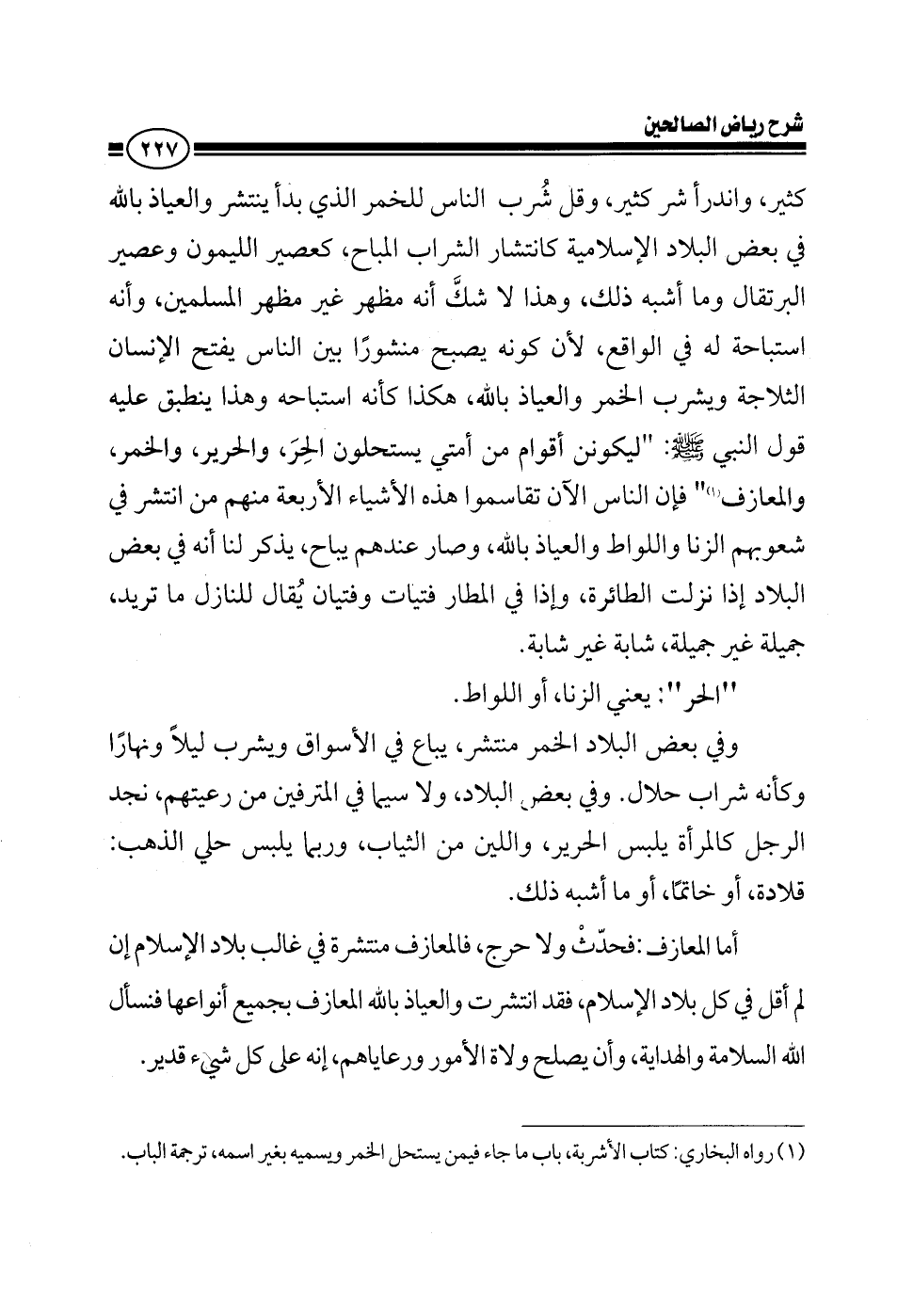 كثير واندرأ شر كثير وقل شرب الناس للخمر الذي بدأ ينتشر والعياذ بالله وفي بعض البلاد الإسلامية انتشر كانتشار الشراب المباح كعصير الليمون وعصير البرتقال وما أشبه ذلك وهذا لا شك أنه مظهر غير مظهر المسلمين وأنه استباحة له في الواقع كونه يصبح منشورا بين الناس يفتح الإنسان الثلاجة ويشرب الخمر والعياذ بالله هكذا كأنه استباحه وهذا ينطبق عليه قول النبي صلى الله عليه وسلم: ليكونن أقوام من أمتي يستحلون الحر والحرير والخمر والمعازف فإن الناس الآن تقاسموا هذه الأشياء الأربعة منهم من انتشر في شعوبهم الزنا واللواط والعياذ بالله وصار عندهم مباحا يذكر لنا أنه في بعض البلاد إذا نزلت الطائرة وإذا في المطار فتيات وفتيان يقالون للنازل ما تريد؟ جميلة غير جميلة شابة غير شابة؟ الحر يعني الزنا أو اللواط وفي بعض البلاد الخمر منتشر يباع في الأسواق ويشرب ليلا ونهارا وكأنه شراب حلال وفي بعض البلاد ولاسيما في المتوفين من رعيتهم نجد الرجل كالمرأة يلبس الحرير واللين من الثياب وربما يلبس حلي الذهب قلادة خاتم أو ما أشبه ذلك والمعازف الآن حدث ولا حرج المعازف منتشرة في غالب بلاد الإسلام إن لم أقل في كل بلاد الإسلام فقد انتشرت والعياذ بالله المعازف بجميع أنواعها فنسأل الله السلامة والهداية وأن يصلح ولاة الأمور ورعاياهم إنه على كل شيء قدير