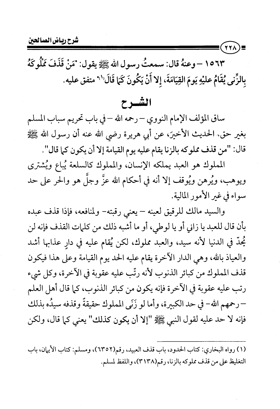 ساق أحاديث وقبلها آية، والحديث الأخير عن أبي هريرة رضي الله عنه أن رسول الله صلى الله عليه وسلم قال: من قذف مملوكه بالزنا أقيم عليه الحد يوم القيامة إلا أن يكون كما قال المملوك هو العبد يملكه الإنسان، والمملوك كالسلعة يباع ويشترى ويوهب، ويرهن ويوقف إلا أن أحكام الله عز وجل هو والحر عل حد سواء في غير الأمور المالية.