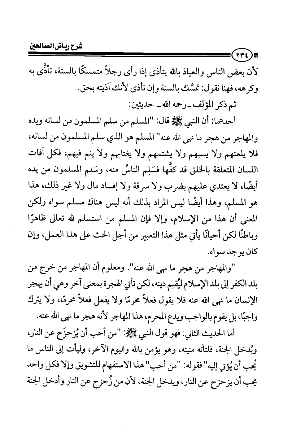 لأن بعض الناس والعياذ بالله يتأذى إذا رأى رجلا متمسكا بالسنة ثم ذكر حديثين أحدهما أن النبي صلى الله عليه وسلم قال: المسلم من سلم المسلمون من لسانه ويده والمهاجر من هجر ما نهى الله عنه المسلم من سلم المسلمون من لسانه فلا يلعنهم ولا يسبهم ولا يشتمهم ولا يغتابهم ولا ينم فيهم، كل آفات اللسان المتعلقة بالخلق قد كفها فسلم الناس منه، وسلم المسلمون من يده أيضا لا يعتدي عليهم بضرب ولا سرقة ولا إفساد مال ولا غير ذلك، هذا هو المسلم وهذا ليس المراد بذلك أنه ليس هناك مسلم سواه ولكن المعنى أن هذا من الإسلام وإلا فإن المسلم من استسلم لله تعالى ظاهراً وباطناً لكن أحيانا يأتي مثل هذا التعبير من أجل الحث على هذا العمل وإن كان يوجد سواه.
