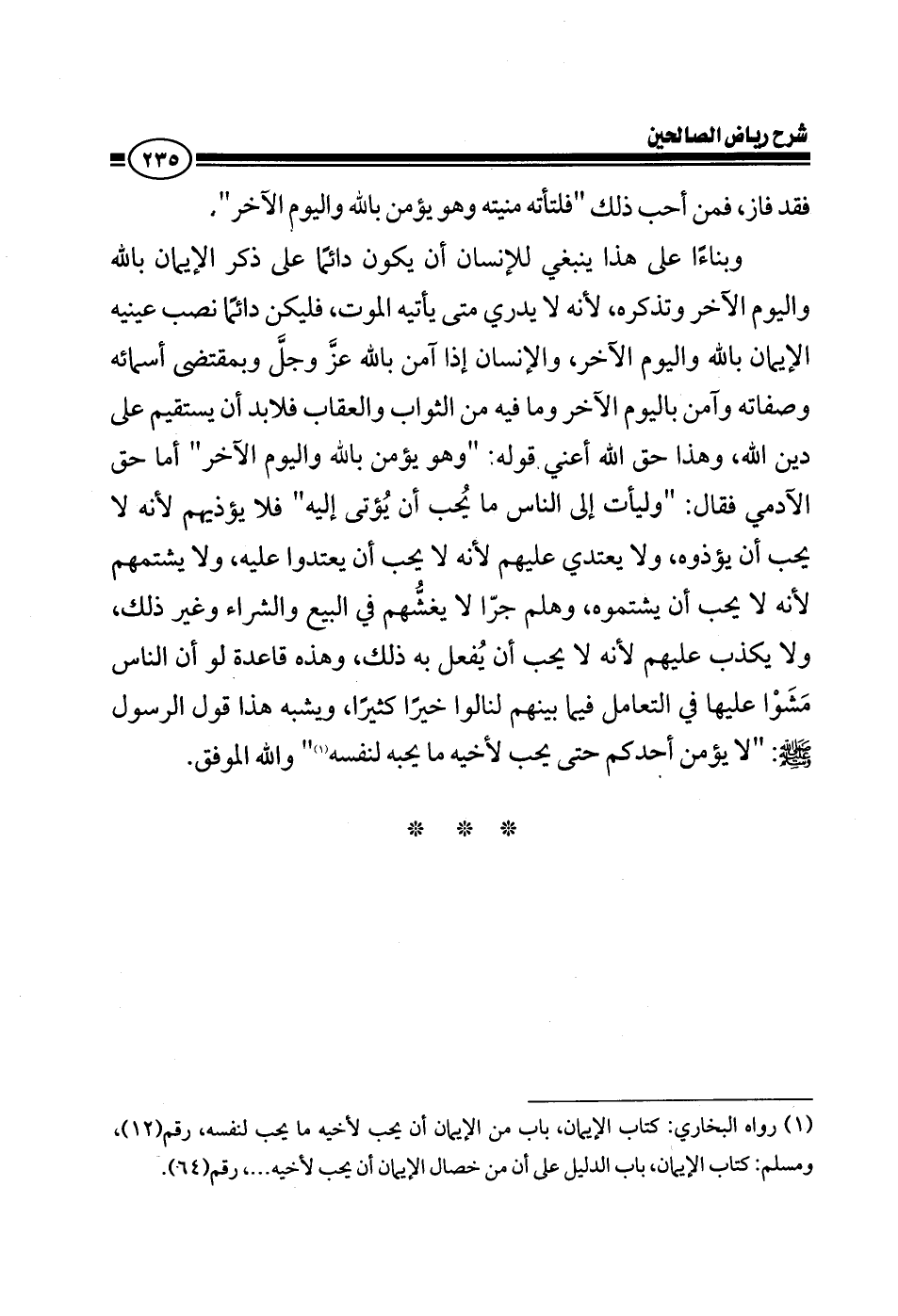 وبناء على هذا ينبغي للإنسان أن يكون دائما على ذكر الإيمان بالله واليوم الآخر وتذكره، لأنه لا يدري متى يأتيه الموت فليكن دائما نصب عينيه الإيمان بالله واليوم الأخر فالإنسان إذا آمن بالله عز وجل وبمقتضى أسمائه وصفاته وآمن باليوم الأخر وما فيه من الثواب والعقاب فلابد أن يستقيم على دين الله وهذا حق الله أعني قوله: وهو يؤمن بالله واليوم الآخر أما حق الآدمي فقال: وليأت إلى الناس ما يحب أن يؤتى إليه فلا يؤذيهم؛ لأنه لا يحب أن يؤذوه ولا يعتدي عليهم لأنه لا يحب أن يعتدوا عليه، ولا يشتمهم لأنه لا يحب أن يشتموه وهلم جرا لا يغشهم في البيع والشراء وغير ذلك ولا يكذب عليهم لأنه لا يحب أن يفعل به ذلك وهذه قاعدة لو أن الناس مشوا عليها في التعامل فيما بينهم لنالوا خيراً كثيراً ويشبه هذا قول الرسول صلى الله عليه وسلم: لا يؤمن أحدكم حتى يحب لأخيه ما يحبه لنفسه والله الموفق
