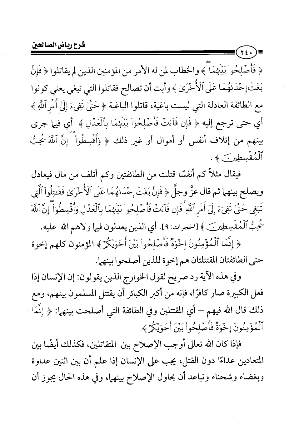 ثم قال عز وجل: {فإن فاءت فأصلحوا بينهما بالعدل وأقسطوا إن الله يحب المقسطين} أي الذين يعدلون فيما ولاهم الله عليه إنما المؤمنون إخوة فأصلحوا بين أخويكم، المؤمنون كلهم إخوة حتى الطائفتين المقتتلتين هم إخوة للذين أصلحوا بينهما وفي هذه الآية رد صريح لقول الخوارج الذين يقولون: إن الإنسان إذا فعل الكبيرة صار كافرا؛ فإنه من أكبر الكبائر أن يقتتل المسلمون بينهم ومع ذلك قال الله في المقتتلين وفي التي أصلحت بينهما {إنما المؤمنون إخوة فأصلحوا بين أخويكم} فإذا كان الله تعالى أوجب الإصلاح بين المتقاتلين فكذلك أيضا بين المتعادين عداء دون قتل، يجب على الإنسان إذا علم أن بين اثنين عداوة وبغضاء وشحناء وتباعدا أن يحاول الإصلاح بينهما.