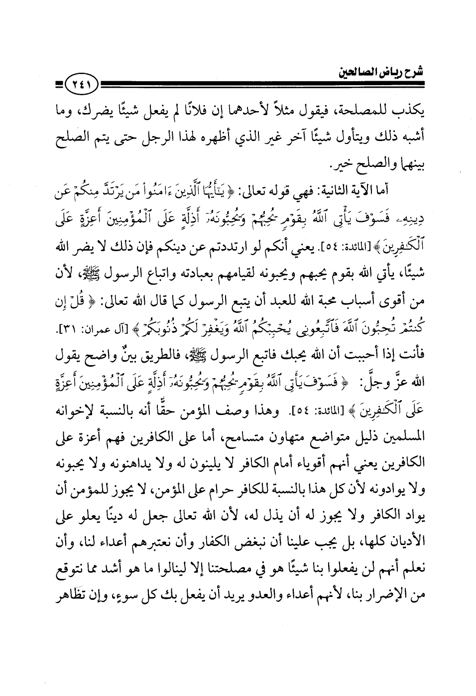 أما الآية الثانية فهي قول الله تعالى: {يا أيها الذين آمنوا من يرتد منكم عن دينه فسوف يأتي الله بقوم يحبهم ويحبونه أذلة على المؤمنين أعزة على الكافرين} يعني أنكم لو ارتدتم عن دينكم فإن ذلك لا يضر الله شيئا يأتي الله بقوم يحبهم ويحبونه لقيامهم بعبادته واتباع الرسول صلى الله عليه وسلم لأن من أقوى أسباب محبة الله للعبد أن يتبع الرسول كما قال الله تعالى: {قل إن كنتم تحبون الله فاتبعوني يحببكم الله ويغفر لكم ذنوبكم} فأنت إذا أحببت أن الله يحبك فأتبع الرسول الطريق بين واضح يقول الله عز وجل {فسوف يأتي الله بقوم يحبهم ويحبونه أذلة على المؤمنين أعزة على الكافرين} وهذا هو وصف المؤمن حقا أنه بالنسبة لإخوانه المسلمين ذليل متواضع متهاون ومتسامح، أما على الكافرين فهم أعزة على الكافرين يعني أنهم أقوياء أمام الكافر لا يلينون له ولا يداهنونه ولا يوادنه، كل هذا بالنسبة للكافر حرام على المؤمن لا يجوز للمؤمن أن يواد الكافر، ولا يجوز له أن يذل له؛ لأن الله تعالى جعل له دينا يعلو على الأديان كلها بل يجب علينا أن نبغض الكفار وأن نعتبرهم أعداء لنا وأن نعلم أنهم لن يفعلوا بنا شيئا هو مصلحتنا إلا لينالوا ما هو أشد مما نتوقع من الإضرار بنا لأنهم أعداء، والعدو ماذا يريد أن يفعل بك؟ يريد أن يفعل بك كل سوء وإن تظاهر