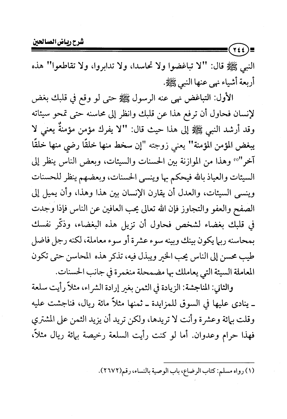 كذلك أيضا لا تناجشوا، المناجشة: الزيادة في الثمن بغير إرادة الشراء، مثلا رأيت سلعة ينادي عليها في السوق، ثمنها مثلاً مائة ريال، وهو يريد شراءها فناجشت عليه وقلت: بمائة وعشرة، وأنت لا تريدها، ولكن تريد أن يزيد الثمن على المشتري هذا حرام عدوان.