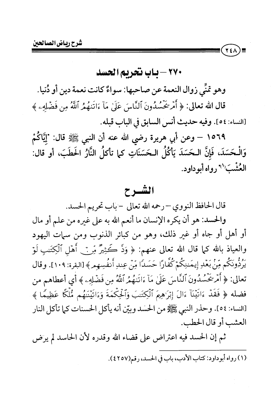 EXقال النووي رحمه الله تعالى في كتابه (رياض الصالحين) : باب تحريم الحسد.