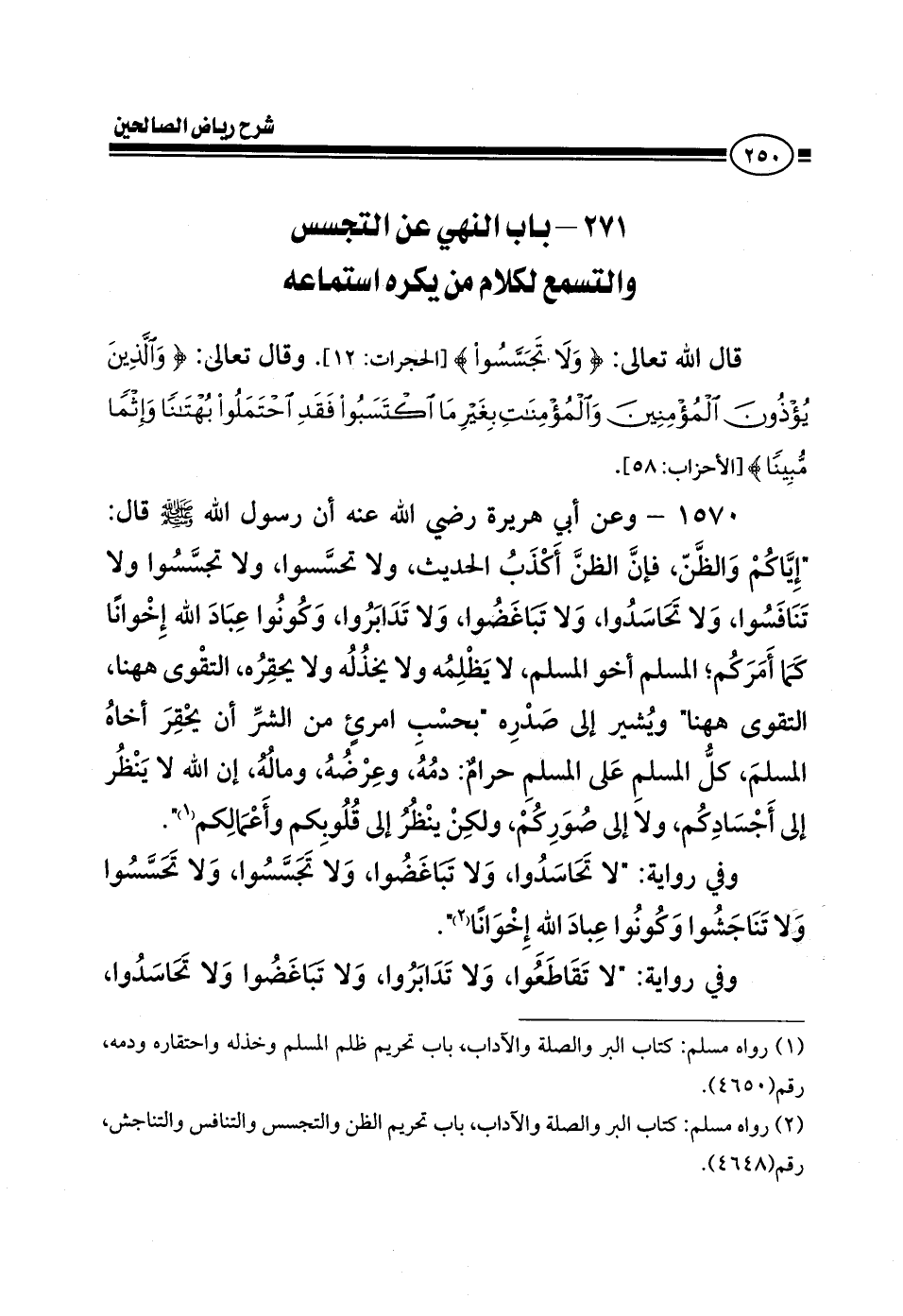 1570 - وعن أبي هريرة رضي الله عنه أن رسول الله صلى الله عليه وسلم قال: إياكم والظن، فإن الظن أكذب الحديث، ولا تحسسوا، ولا تجسسوا، ولا تنافسوا ولا تحاسدوا، ولا تباغضوا، ولا تدابروا، وكونوا عباد الله إخوانا كما أمركم.