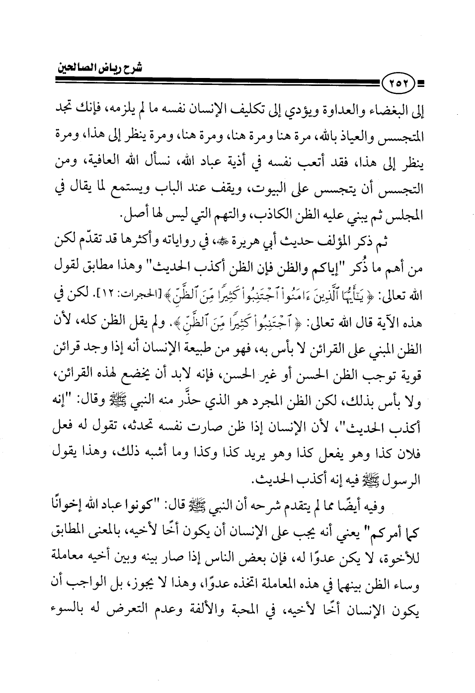 إلى البغضاء والعداوة ويؤدي إلى تكليف الإنسان نفسه ما لم يلزمه، فإنك تجد المتجسس والعياذ بالله، مرة هنا ومرة هنا، ومرة هنا، ومرة ينظر إلى هذا ومرة ينظر إلى هذا، فقد أتعب نفسه في أذية عباد الله، نسأل الله العافية، ومن ذلك أيضا أن يتجسس على البيوت، يعني من التجسس أن يتجسس على البيوت، يقف عند الباب ويستمع لما يقال في المجلس ثم يبني عليه الظن الكاذب، والتهم التي ليس لها أصل، ثم ذكر المؤلف حديث أبي هريرة في رواياته وأكثرها قد مر علينا لكن من أهم ما ذكر إياكم والظن فإن الظن أكذب الحديث وهذا مطابق لقول الله تعالى: {يا أيها الذين آمنوا اجتنبوا كثيرا من الظن} لكن في هذه الآية قال الله تعالى: {اجتنبوا كثيرا من الظن} ولم يقل الظن كله؛ لأن الظن المبني على قرائن لا بأس به، فهو من طبيعة الإنسان أنه إذا وجد قرائن قوية توجب الظن الحسن أو غير الحسن، فإنه لابد أن يخضع لهذا القرائن، ولا بأس بذلك، لكن الظن المجرد هو الذي حذر منه النبي صلى الله عليه وسلم وقال: إنه أكذب الحديث، لأن الإنسان إذا ظن صارت نفسه تحدثه، تقول له فعل فلان كذا وهو يفعل كذا وهو يريد كذا وما أشبه ذلك، وهذا يقول الرسول صلى الله عليه وسلم فيه إنه اكذب الحديث، وفيه أيضا مما لم يمر أن النبي صلى الله عليه وسلم قال كونوا عباد الله إخوانا كما أمركم يعني أنه يجب على الإنسان أن يكون أخا لأخيه، بالمعنى المطابق للأخوة، لا يكن عدوا له، فإن بعض الناس إذا صار بينه وبين أخيه معاملة وساء الظن بينهما في هذه المعاملة اتخذوا عدوا، وهذا لا يجوز، الواجب أن الإنسان يكون أخا لأخيه، في المحبة والألفة وعدم التعرض له بالسوء