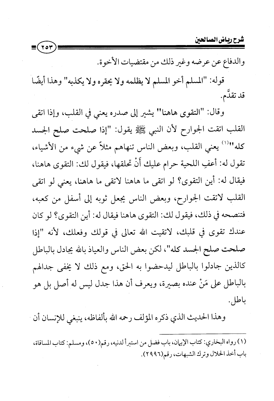 والدفاع عن عرضه وغير ذلك من مقتضيات الأخوة المسلم أخو المسلم لا يظلمه ولا يحقره ولا يكذبه وهذا أيضا قد مر علينا سابقا وقال التقوى هاهنا يشير إلى صدره يعني في القلب، وإذا اتقى القلب اتقت الجوارح؛ لأن النبي صلى الله عليه وسلم يقول إذا صلحت صلح الجسد كله يعني القلب، بعض الناس تنهاهم مثلا عن شيء من الأشياء، أعفي اللحية حرام عليك أنك تحلقها، فيقول لك التقوى هاهنا، أين التقوى؟ لو اتقى ما هاهنا لأتقى ما هاهنا، يعني لو اتقى القلب اتقت الجوارح، بعض الناس تنصحه في طول الثوب، تجد ثوبه إلى أسفل من كعبه، تنصحه في ذلك، فيقول لك التقوى هاهنا أين التقوى، لو كان عندك تقوى في قلبك، لاتقيت الله تعالى في قولك وفعلك، لأنه إذا صلحت صلح الجسد كله، لكن بعض الناس والعياذ بالله يجادل بالباطل كالكافرين، جادلوا بالباطل ليدحضوا به الحق، ومع ذلك لا يخفى جدالهم بالباطل على من عنده بصيرة، يعرف أن هذا جدل ليس له أصل بل هو باطل، وهذا الحديث الذي ذكره المؤلف بألفاظه، ينبغي للإنسان أن