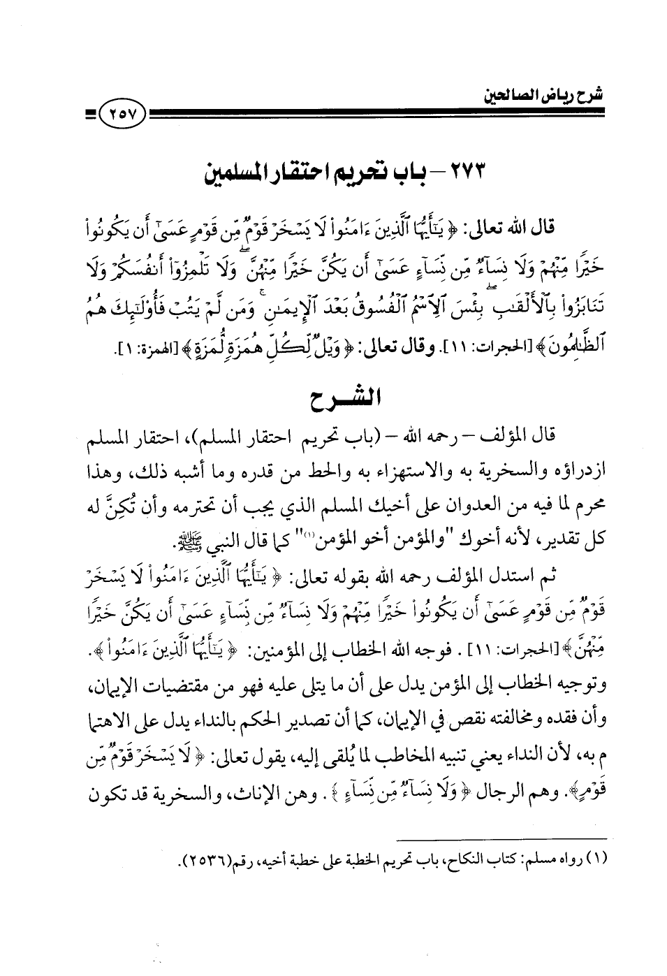 EXقال المؤلف رحمه الله في كتابه رياض الصالحين باب تحريم احتقار المسلم، احتقار المسلم ازدراؤه والسخرية به والاستهزاء به والحط من قدره وما أشبه ذلك، وهذا محرم لما فيه من العدوان على أخيك المسلم الذي يجب أن تحترمه وأن تكن له كل تقدير، لأنه أخوك والمؤمن أخو المؤمن كما قال النبي صلى الله عليه وسلم، ثم استدل المؤلف رحمه الله بقوله تعالى: يا أيها الذين آمنوا لا يسخر قوم من قوم عسى أن يكونوا خيرا منهم ولا نساء من نساء عسى أن يكن خيرا منهن فوجه الله الخطاب إلى المؤمنين {يا أيها الذين آمنوا} وتوجيه الخطاب للمؤمن يدل على أن ما يتلى عليه فهو من مقتضيات الإيمان وأن فقده ومخالفته نقص في الإيمان، كما أن تصدير الحكم بالنداء يدل على الاهتمام به، لأن النداء يعني تنبيه المخاطب لما يلقي إليه، يقول: {لا يسخر قوم من قوم} وهم الرجال {ولا نساء من نساء} وهن النساء الآيات، والسخرية قد تكون