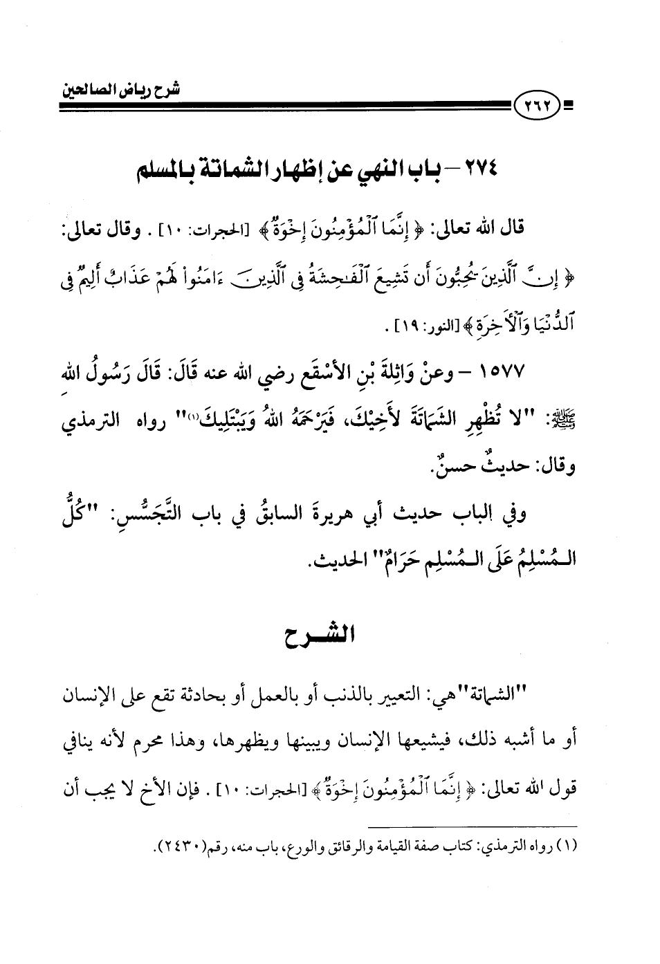 EXهذان بابان ذكرهما المؤلف رحمه الله في كتابه (رياض الصالحين) الأول في الشماتة، والثاني في الطعن في النسب.