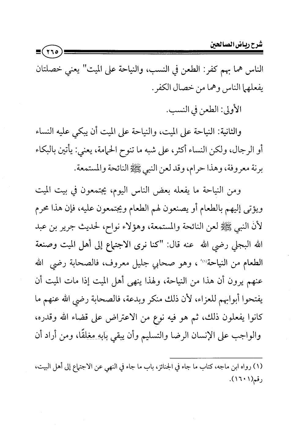الناس هما بهم كفر يعني خصلتان يفعلهما الناس وهم من خصال الكفر، الطعن في النسب، والثانية النياحة على الميت، النياحة على الميت أن يبكي عليه النساء أو الرجال أيضاً، لكن النساء أكثر، على شبه ما تنوح الحمامة، يعني: يأتين بالبكاء برنة معروفة، هذا حرام وقد لعن النبي صلى الله عليه وسلم النائحة والمستمعة ومن النياحة ما يفعله بعض الناس اليوم، يجتمعون في بيت الميت ويؤتى إليهم بالطعام أو يصنعون هم الطعام ويجتمعون عليه، فإن هذا محرم لأن النبي صلى الله عليه وسلم لعن النائحة والمستمعة، وهؤلاء نواح، لحديث جرير بن عبد الله البجلي رضي الله عنه قال: كنا نعد الاجتماع في بيت الميت وصنع الطعام من النياحة وهو صحابي جليل معروف، فالصحابة يرون أن هذا من الناحية، ولهذا ينهي أهل الميت إذا مات أن يفتحوا أبوابهم للعزاء، لأن ذلك منكر وبدعة، فالصحابة ما كانوا يفعلون ذلك، ثم هو فيه نوع من الاعتراض على قضاء الله وقدره، والواجب على الإنسان الرضا والتسليم وأن يبقي بابه مغلقا، ومن أراد أن