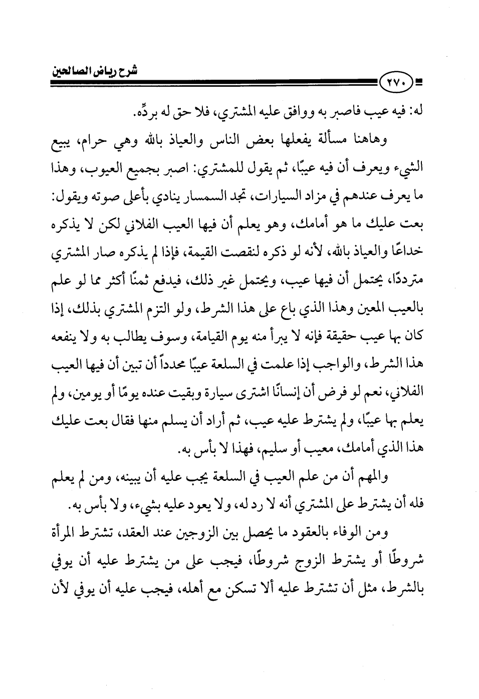 وهاهنا مسألة يتخذها بعض الناس والعياذ بالله وهي حرام يبيع الشيء ويعرف أن فيه عيبا، ثم يقول للمشتري، ترى ما بعت عليك إلا ما أمامك واصبر بجميع العيوب، وهذا ما يعرف عندهم في حارات السيارات حارات تحت المكرفون، تجد السمسار الذي هو الدلال، ينادي بأعلى صوته ويقول: ترى ما بعت عليك إلا الإطارات، ما بعت عليك إلا الكبوت، ما بعت عليك إلا كذا وكذا، وهو يعلم أن فيها العيب الفلاني لكن لا يذكره خداعا والعياذ بالله، لأنه لو ذكره لنقصت القيمة، فإذا لم يذكره صار المشتري مترددا، يحتمل فيها عيب، يحتمل ما فيها عيب، فيدفع ثمنا أكثر مما لو علم بالعيب المعين وهذا الذي باع على هذا الشرط، ولو التزم المشتري بذلك، إذا كان بها عيب حقيقة فإنه لا يبرأ منه يوم القيامة، سوف يطالب به ولا ينفع هذا الشرط، الواجب إذا علمت في السلعة عيبا أن تبين أن فيها العيب الفلاني، نعم لو فرض أن إنسانا اشترى سيارة وبقيت عنده يوما أو يومين، ولم يعلم بها عيب، ولم يشترط عليه عيب، ثم أراد أن يسلم منها قال بعت عليك هذا الذي أمامك، معيب أو سليم، ما علي منها، فهذا لا بأس به.