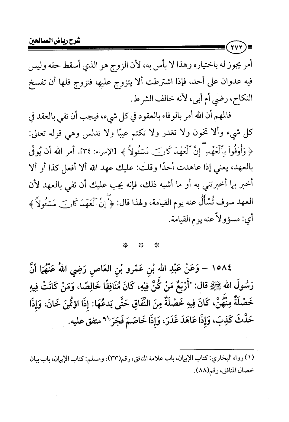 1584 - وعن عبد الله بن عمرو بن العاص رضي الله عنهما أن رسول الله صلى الله عليه وسلم قال: أربع من كن فيه، كان منافقا خالصا، ومن كانت فيه خصلة منهن، كان فيه خصلة من النفاق حتى يدعها: إذا أؤتمن خان، وإذا حدث كذب، وإذا عاهد غدر، وإذا خاصم فجر متفق عليه.