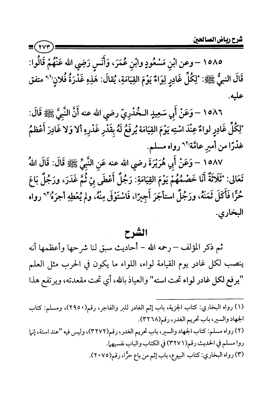 1585 - وعن ابن مسعود، وابن عمر، وأنس رضي الله عنهم قالوا: قال النبي صلى الله عليه وسلم: لكل غادر لواء يوم القيامة، يقال: هذه غدرة فلان متفق عليه.